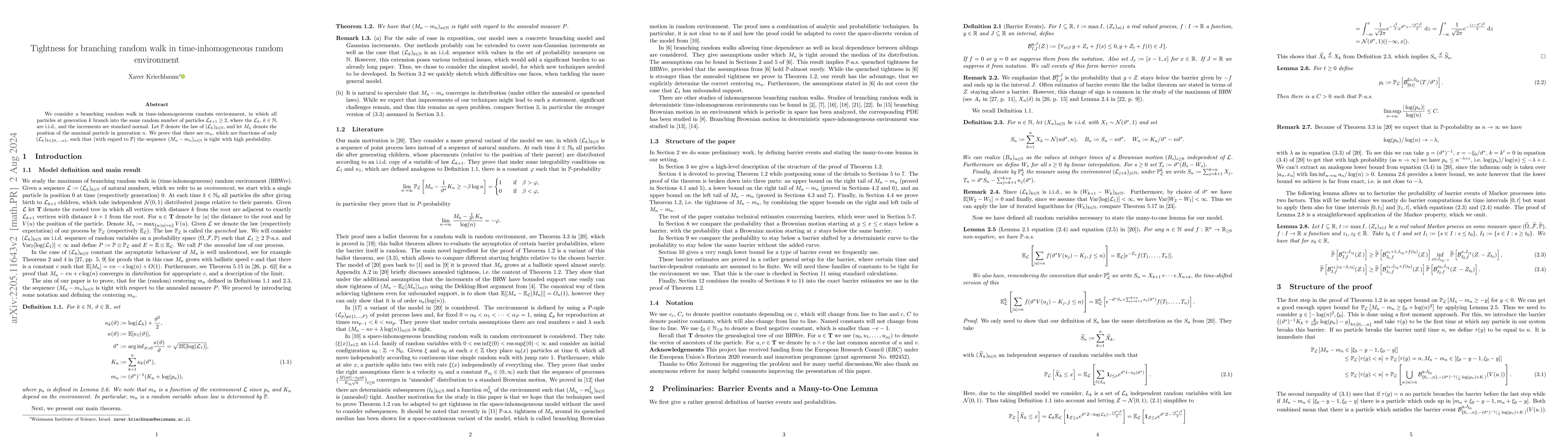 This paper investigates a branching random walk in a time-inhomogeneous random environment where particles branch into a random number of offspring. It proves the tightness of the sequence of positions of the maximal particle, establishing bounds dependent only on the branching process up to the current generation.