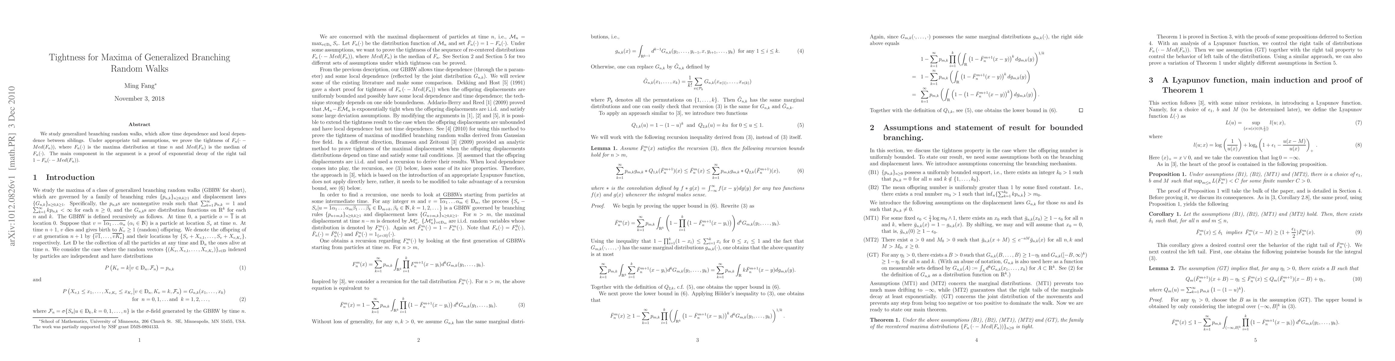 This paper proves the tightness of the maxima distribution in generalized branching random walks, showing that $F_n(\cdot-Med(F_n))$ remains bounded under tail assumptions. The key result is the exponential decay of the right tail $1-F_n(\cdot-Med(F_n))$, which supports the tightness.