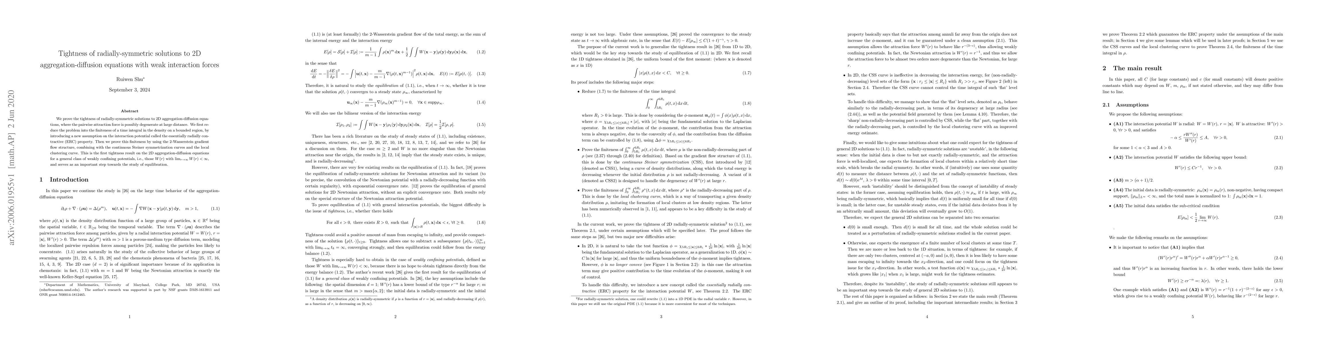 We prove the tightness of radially-symmetric solutions to 2D aggregation-diffusion equations, where the pairwise attraction force is possibly degenerate at large distance. We first reduce the problem into the finiteness of a time integral in the density on a bounded region, by introducing a new assumption on the interaction potential called the essentially radially contractive (ERC) property. Then we prove this finiteness by using the 2-Wasserstein gradient flow structure, combining with the continuous Steiner symmetrization curves and the local clustering curve. This is the first tightness result on the 2D aggregation-diffusion equations for a general class of weakly confining potentials, i.e., those $W(r)$ with $\lim_{r\rightarrow\infty}W(r)<\infty$, and serves as an important step towards the study of equilibration.