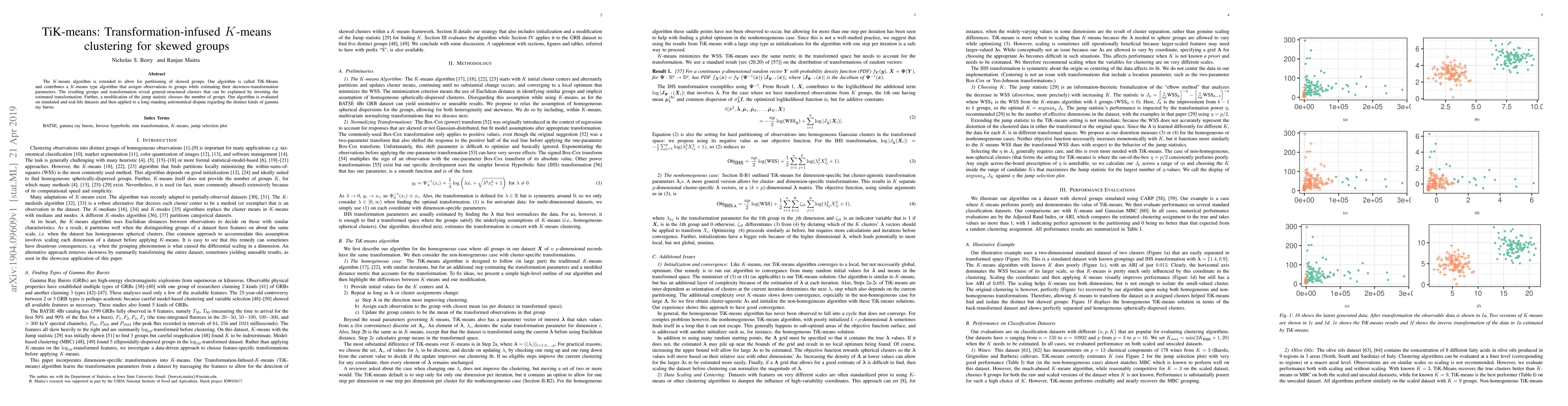 TiK-means extends the $K$-means algorithm to handle skewed groups by estimating skewness-transformation parameters, revealing structured clusters. The modified jump statistic determines the optimal number of groups, demonstrated on both simulated and real datasets, including resolving an astronomical debate on gamma ray bursts.