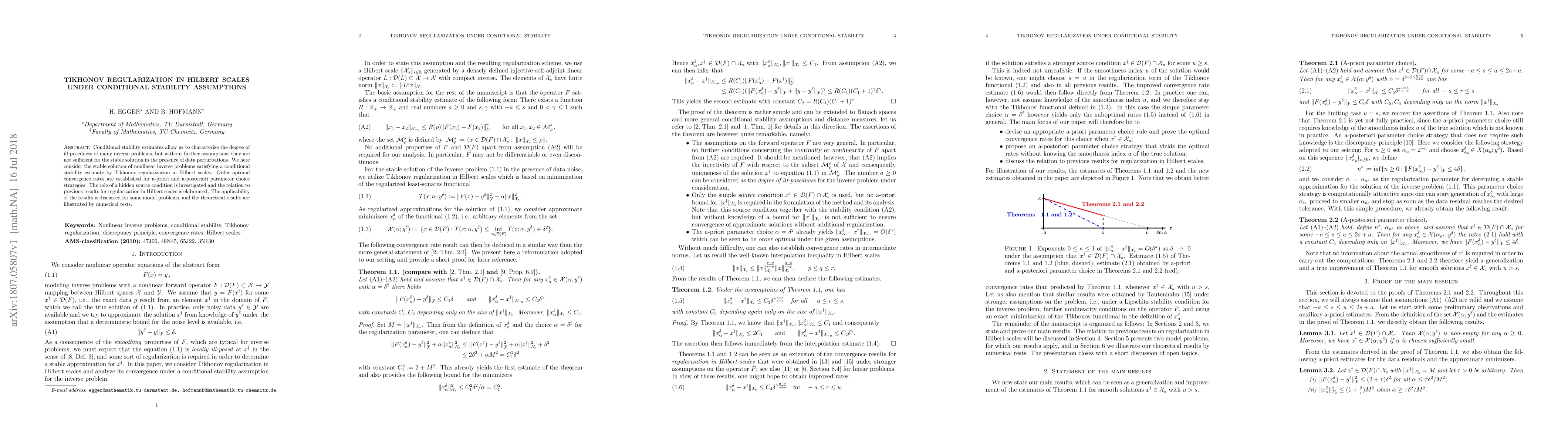 Conditional stability estimates allow us to characterize the degree of ill-posedness of many inverse problems, but without further assumptions they are not sufficient for the stable solution in the presence of data perturbations. We here consider the stable solution of nonlinear inverse problems satisfying a conditional stability estimate by Tikhonov regularization in Hilbert scales. Order optimal convergence rates are established for a-priori and a-posteriori parameter choice strategies. The role of a hidden source condition is investigated and the relation to previous results for regularization in Hilbert scales is elaborated. The applicability of the results is discussed for some model problems, and the theoretical results are illustrated by numerical tests.