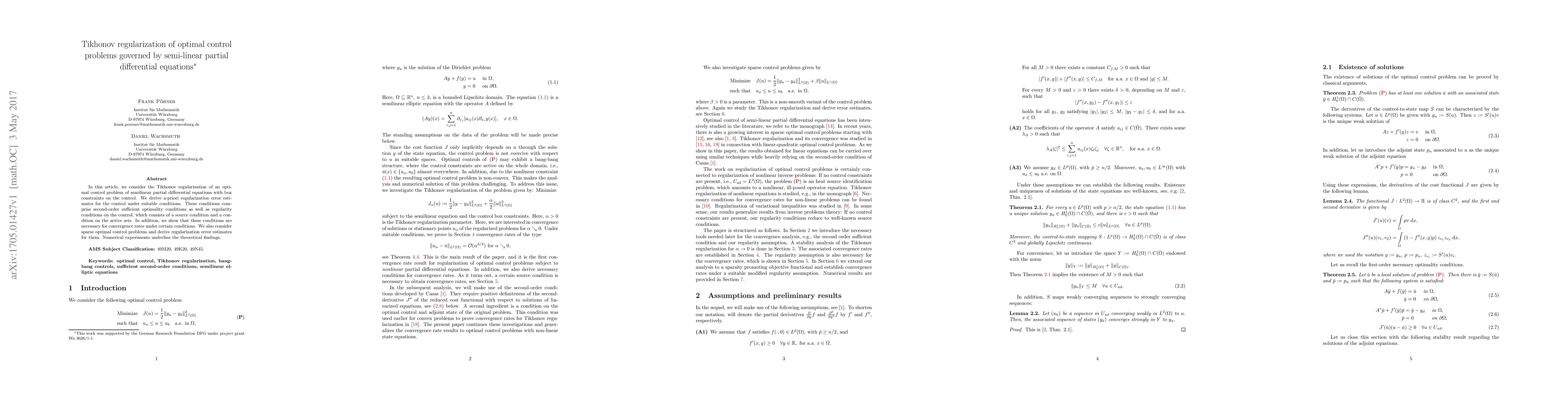 This paper explores Tikhonov regularization for optimal control problems governed by semi-linear partial differential equations, deriving a-priori error estimates under specific conditions. It also investigates sparse optimal control scenarios and validates theoretical results with numerical experiments.