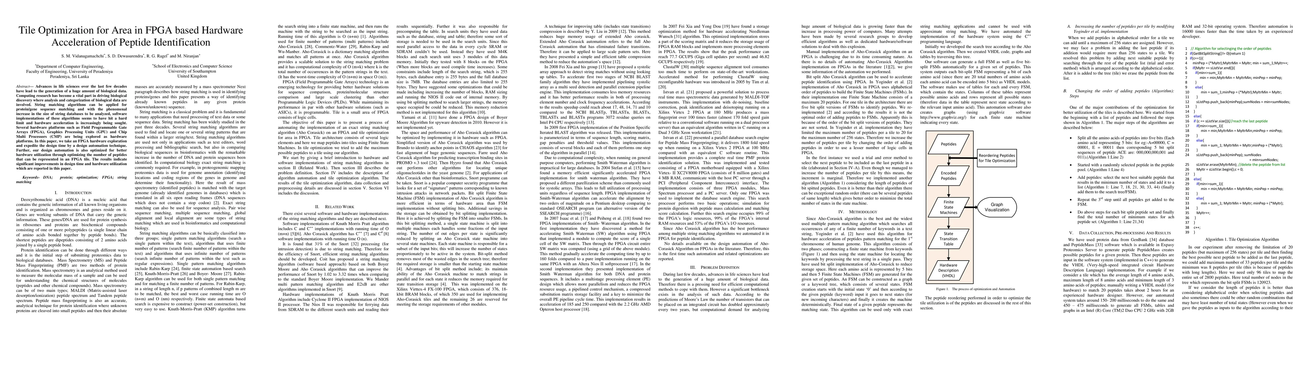 This paper explores the FPGA-based hardware acceleration for peptide identification using string matching algorithms, focusing on optimizing design time and hardware utilization through a design automation technique that minimizes the number of peptides represented in an FPGA tile. The results show significant enhancements in both design time and FPGA resource efficiency.