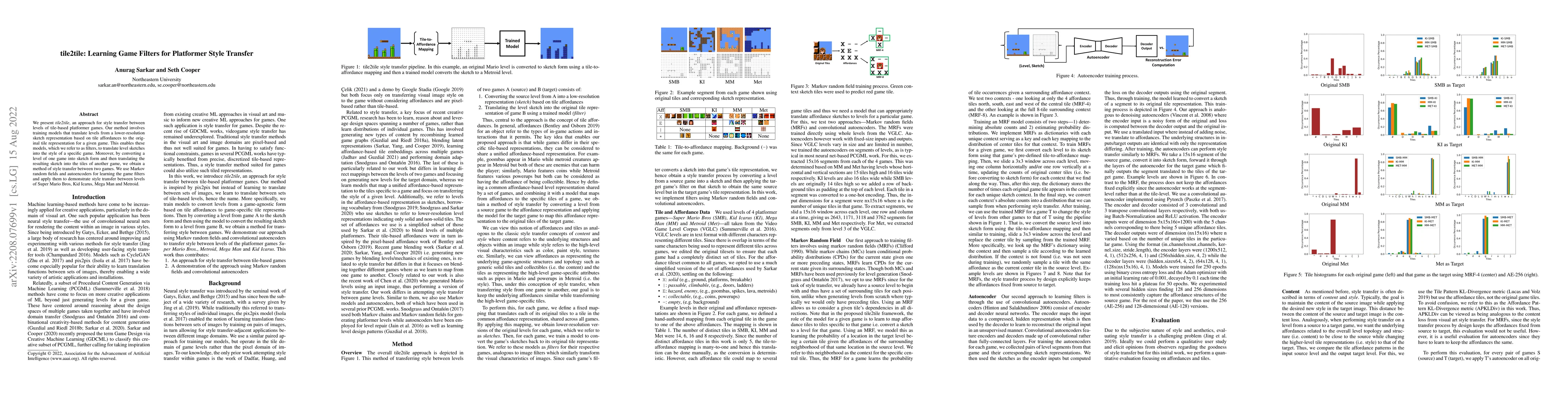 Tile2tile is a method for style transfer between tile-based platformer games by training models to translate lower-resolution sketches into the original tile representation of a specific game, enabling cross-game style transfer. The approach uses Markov random fields and autoencoders to learn game filters, demonstrated through style transfer between games like Super Mario Bros, Kid Icarus, Mega Man, and Metroid.