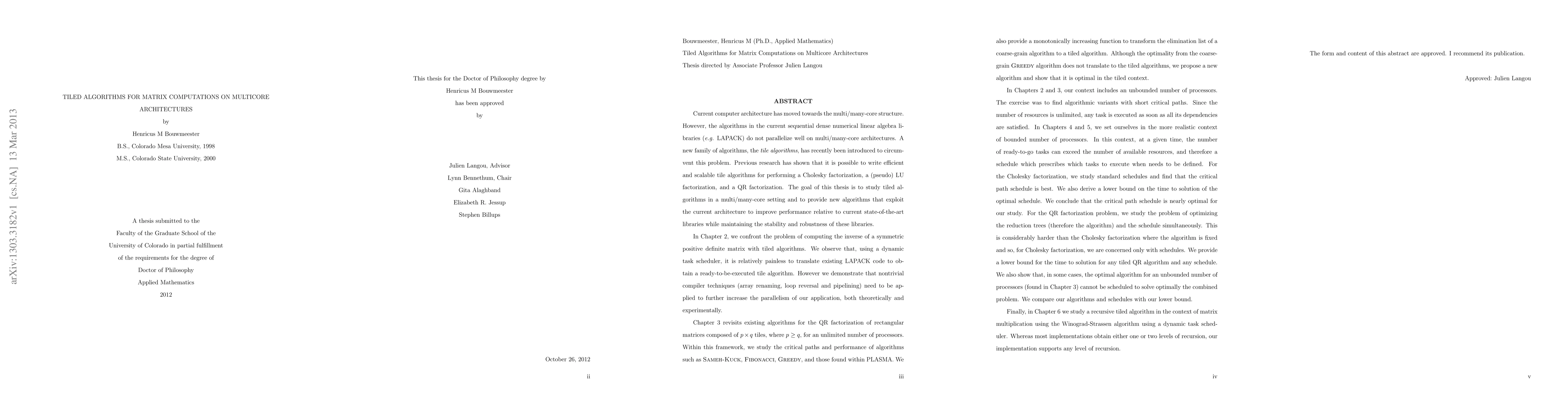 This paper explores tiled algorithms for matrix computations on multicore architectures to improve performance over existing sequential libraries like LAPACK. It aims to develop new scalable tile algorithms for Cholesky, LU, and QR factorizations that leverage multicore capabilities while preserving numerical stability.