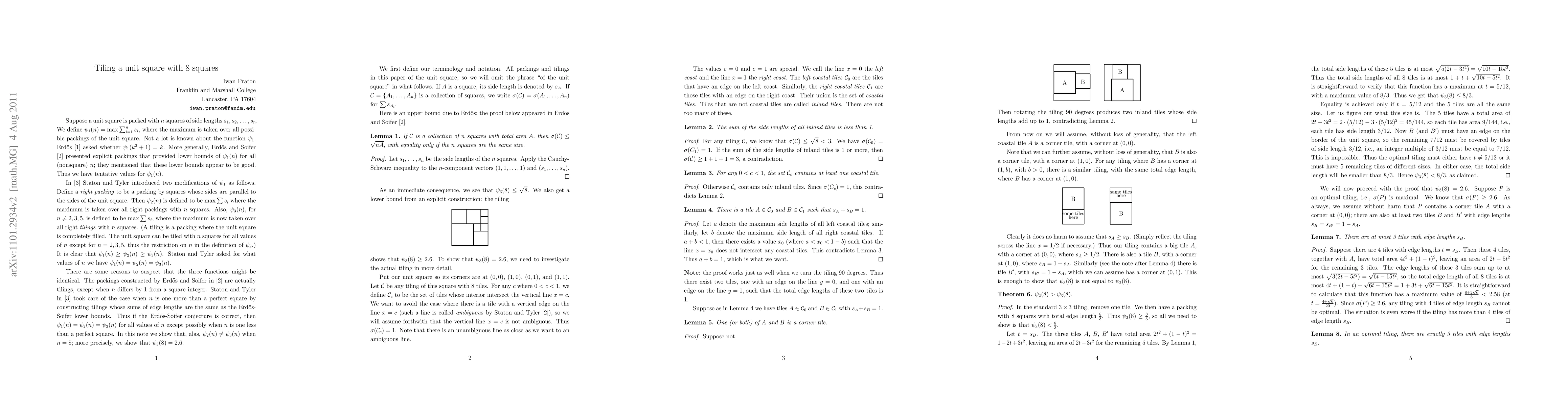 This paper investigates the optimal packing of n nonoverlapping squares within a unit square, comparing the sum of edge lengths for arbitrary packings (f(n)) and perfect tilings (g(n)). It demonstrates that for n=8, the sum of edge lengths for any packing (f(8)) exceeds that for a perfect tiling (g(8)), with g(8) = 13/5 and f(8) ≥ 8/3.