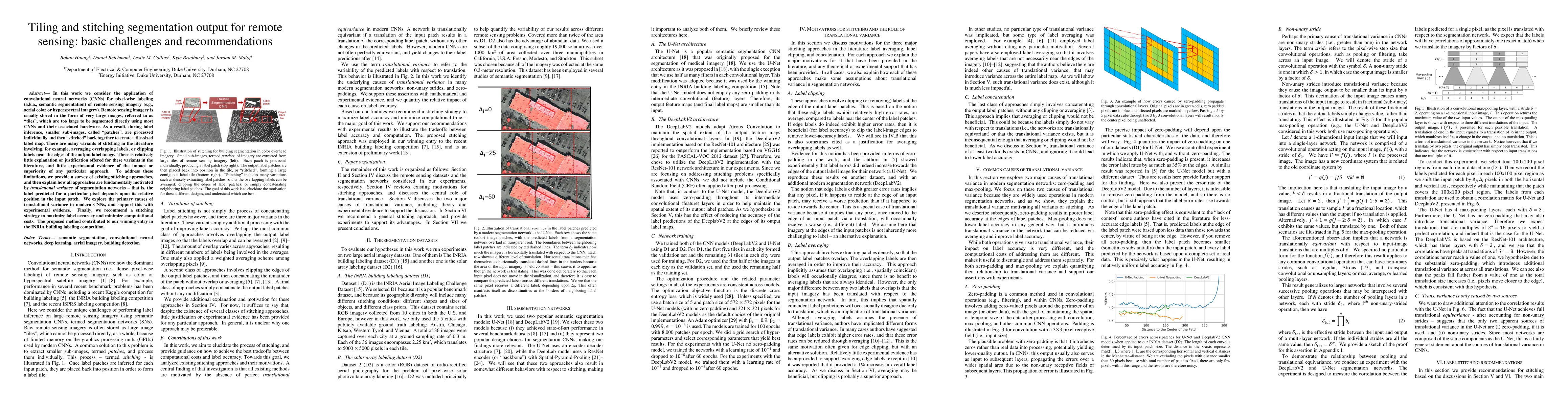 In this work we consider the application of convolutional neural networks (CNNs) for pixel-wise labeling (a.k.a., semantic segmentation) of remote sensing imagery (e.g., aerial color or hyperspectral imagery). Remote sensing imagery is usually stored in the form of very large images, referred to as "tiles", which are too large to be segmented directly using most CNNs and their associated hardware. As a result, during label inference, smaller sub-images, called "patches", are processed individually and then "stitched" (concatenated) back together to create a tile-sized label map. This approach suffers from computational ineffiency and can result in discontinuities at output boundaries. We propose a simple alternative approach in which the input size of the CNN is dramatically increased only during label inference. This does not avoid stitching altogether, but substantially mitigates its limitations. We evaluate the performance of the proposed approach against a vonventional stitching approach using two popular segmentation CNN models and two large-scale remote sensing imagery datasets. The results suggest that the proposed approach substantially reduces label inference time, while also yielding modest overall label accuracy increases. This approach contributed to our wining entry (overall performance) in the INRIA building labeling competition.