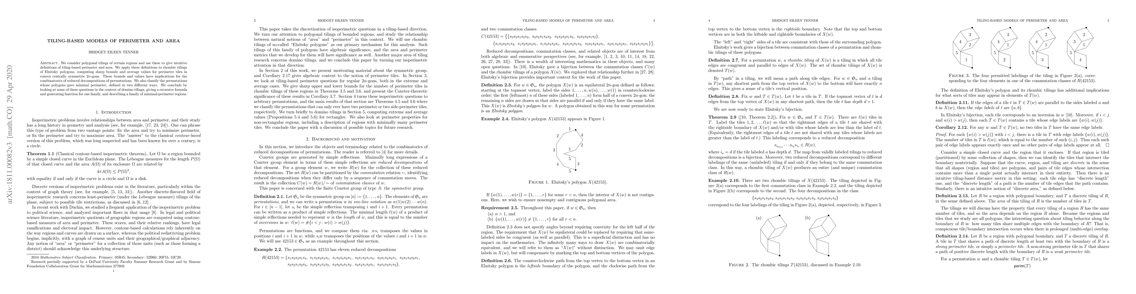 This paper develops tiling-based definitions for perimeter and area using polygonal tilings, specifically focusing on rhombic tilings of Elnitsky polygons. It computes bounds and average values for perimeter tiles in convex centrally symmetric polygons, linking these results to the combinatorics of reduced decompositions of permutations.