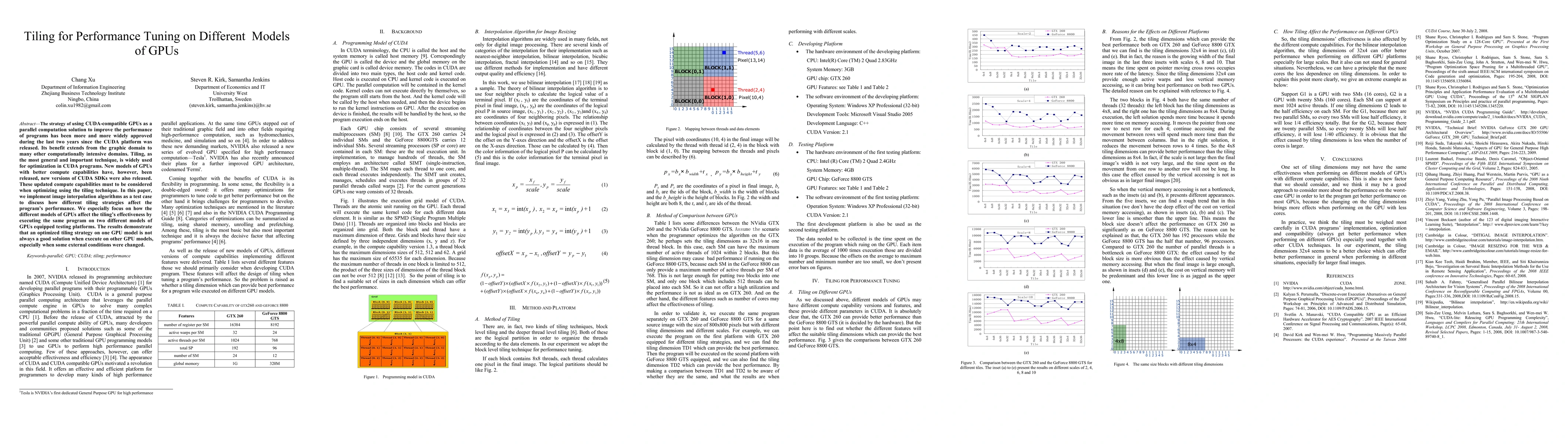 The strategy of using CUDA-compatible GPUs as a parallel computation solution to improve the performance of programs has been more and more widely approved during the last two years since the CUDA platform was released. Its benefit extends from the graphic domain to many other computationally intensive domains. Tiling, as the most general and important technique, is widely used for optimization in CUDA programs. New models of GPUs with better compute capabilities have, however, been released, new versions of CUDA SDKs were also released. These updated compute capabilities must to be considered when optimizing using the tiling technique. In this paper, we implement image interpolation algorithms as a test case to discuss how different tiling strategies affect the program's performance. We especially focus on how the different models of GPUs affect the tiling's effectiveness by executing the same program on two different models of GPUs equipped testing platforms. The results demonstrate that an optimized tiling strategy on one GPU model is not always a good solution when execute on other GPU models, especially when some external conditions were changed.