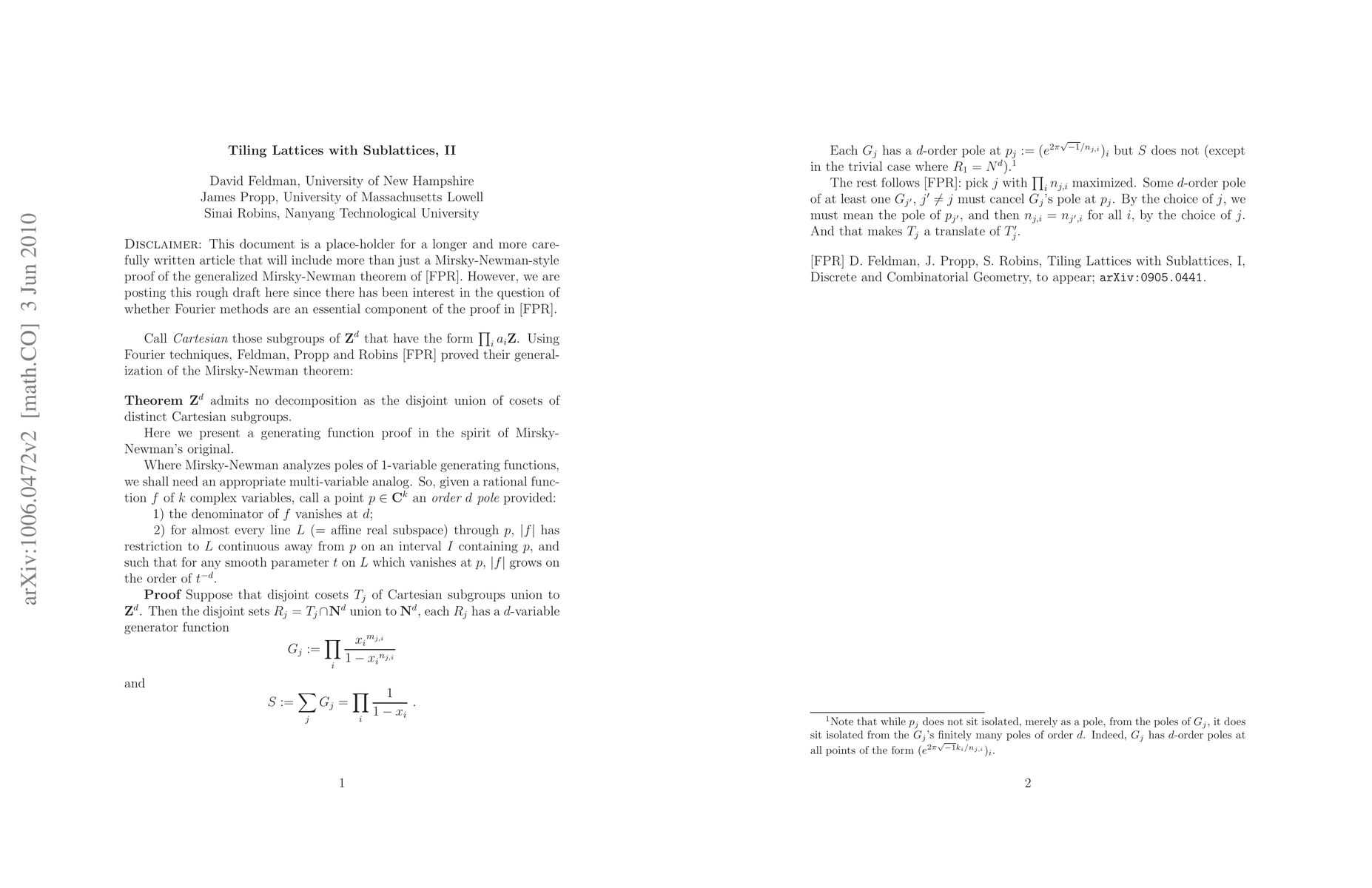 The paper employs generating functions to re-prove a theorem about tiling lattices with sublattices, originally demonstrated using Fourier techniques in a previous work.