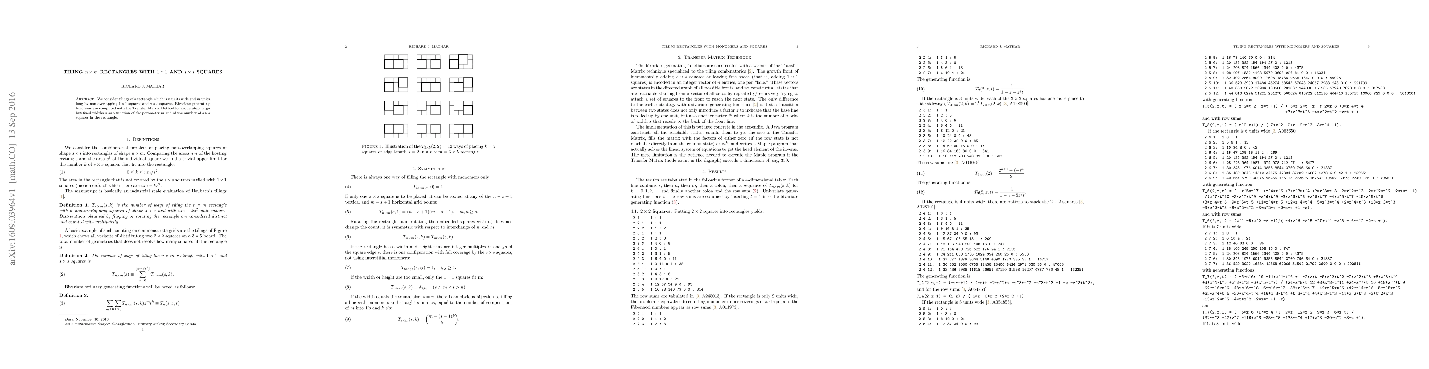 We consider tilings of a rectangle which is n units wide and m units long by non-overlapping 1 X 1 squares and s X s squares. Bivariate generating functions are computed with the Transfer Matrix Method for moderately large but fixed widths n as a function of the parameter m and of the number of s X s squares in the rectangle.