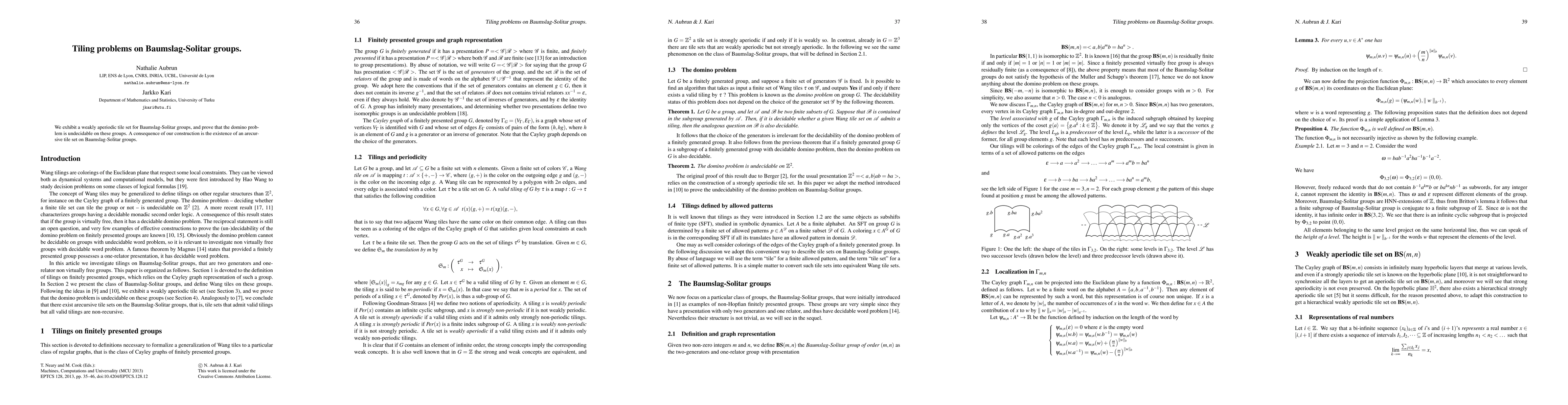 Summary: This paper presents a weakly aperiodic tile set for Baumslag-Solitar groups and demonstrates that the domino problem is undecidable within these groups, leading to the existence of an arecursive tile set.
