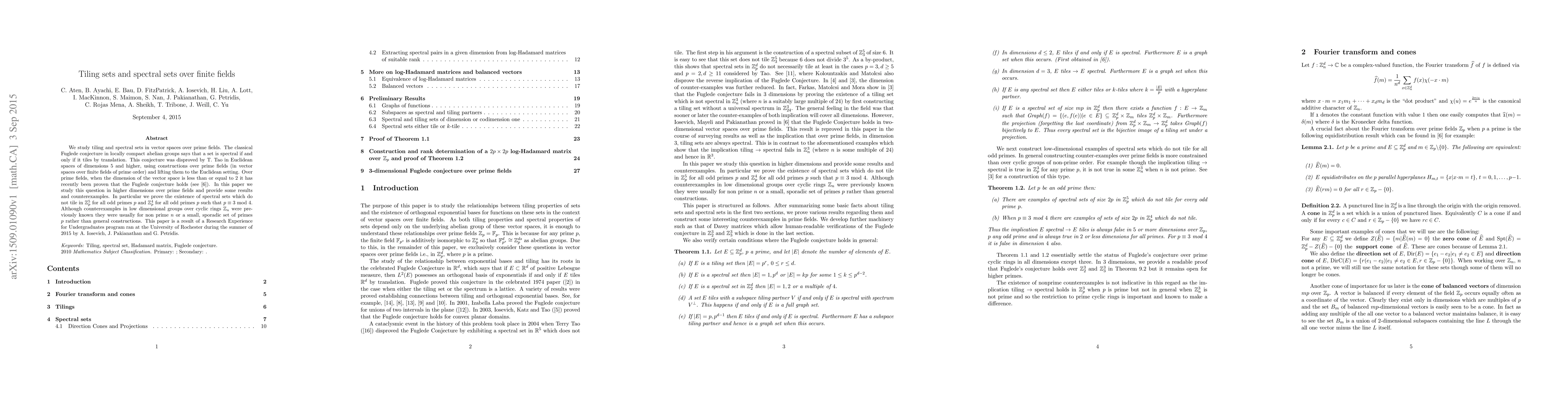 The paper studies tiling and spectral sets in vector spaces over prime fields, disproving the classical Fuglede conjecture in Euclidean spaces of dimensions 5 and higher using constructions over prime fields and lifting them to the Euclidean setting. It provides results and counterexamples, proving the existence of spectral sets which do not tile in Z_p^5 for all odd primes p and Z_p^4 for all odd primes p such that p ≡ 3 (mod 4).