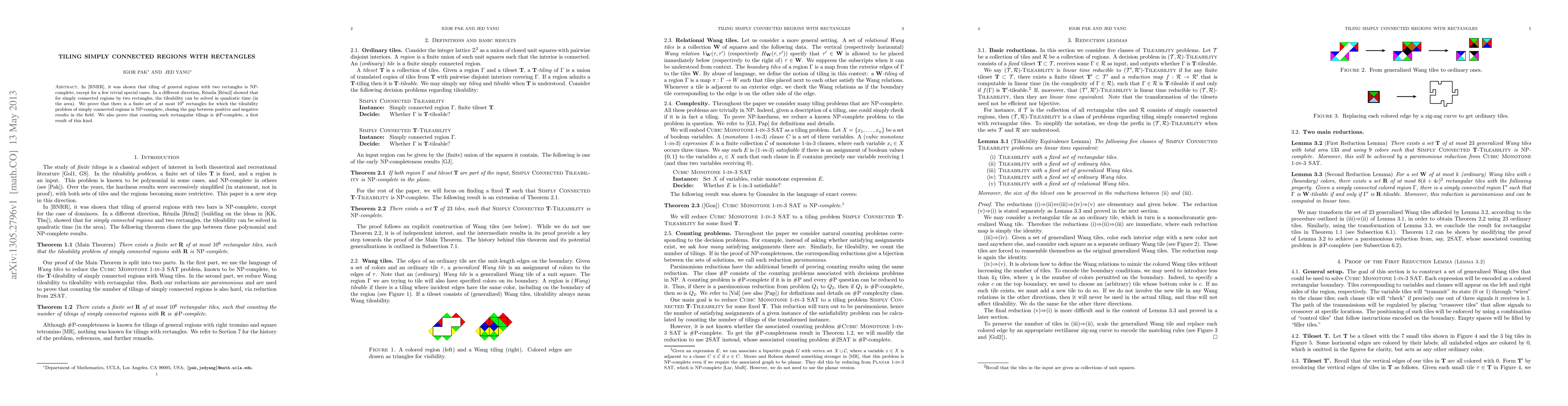 In [BNRR], it was shown that tiling of general regions with two rectangles is NP-complete, except for a few trivial special cases. In a different direction, R\'emila showed that for simply connected regions by two rectangles, the tileability can be solved in quadratic time (in the area). We prove that there is a finite set of at most 10^6 rectangles for which the tileability problem of simply connected regions is NP-complete, closing the gap between positive and negative results in the field. We also prove that counting such rectangular tilings is #P-complete, a first result of this kind.