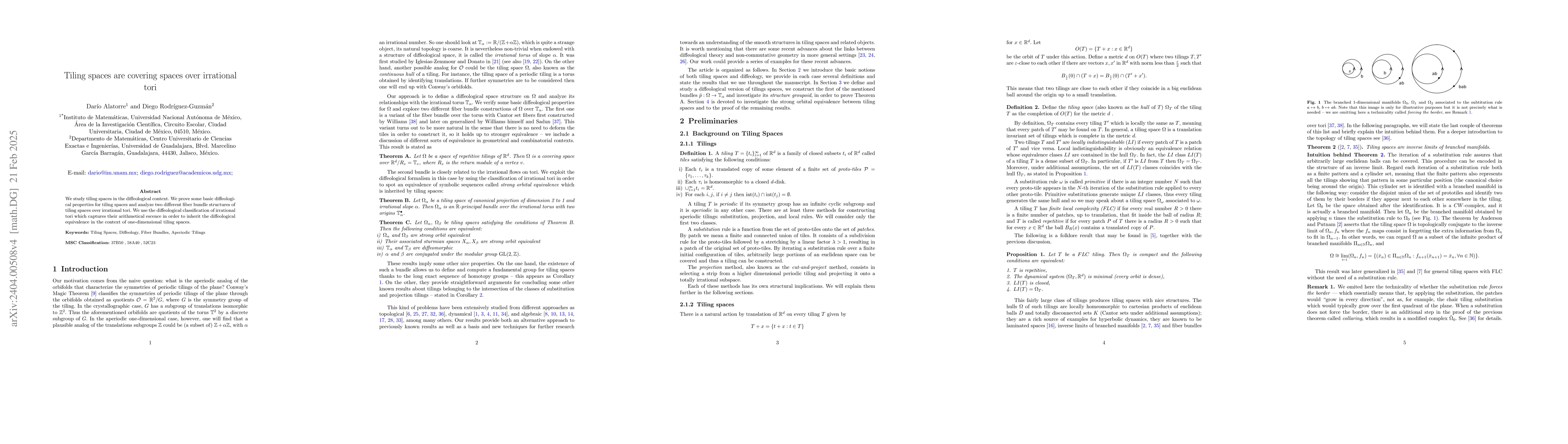 This paper explores tiling spaces within the framework of diffeology, establishing fundamental properties and examining two fiber bundle structures for one-dimensional tiling spaces over irrational tori, leveraging their diffeological classification to demonstrate their equivalence.