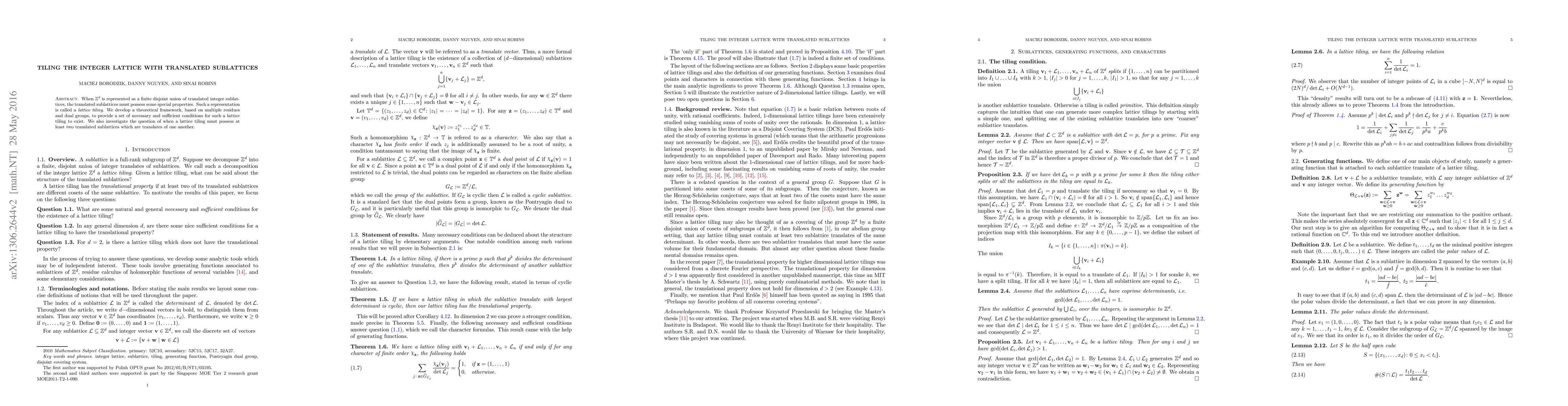This paper develops a theoretical framework for lattice tiling of $\mathbb{Z}^d$ using translated sublattices, establishing necessary and sufficient conditions for such tilings. It also explores scenarios where the tiling requires at least two identical sublattices.