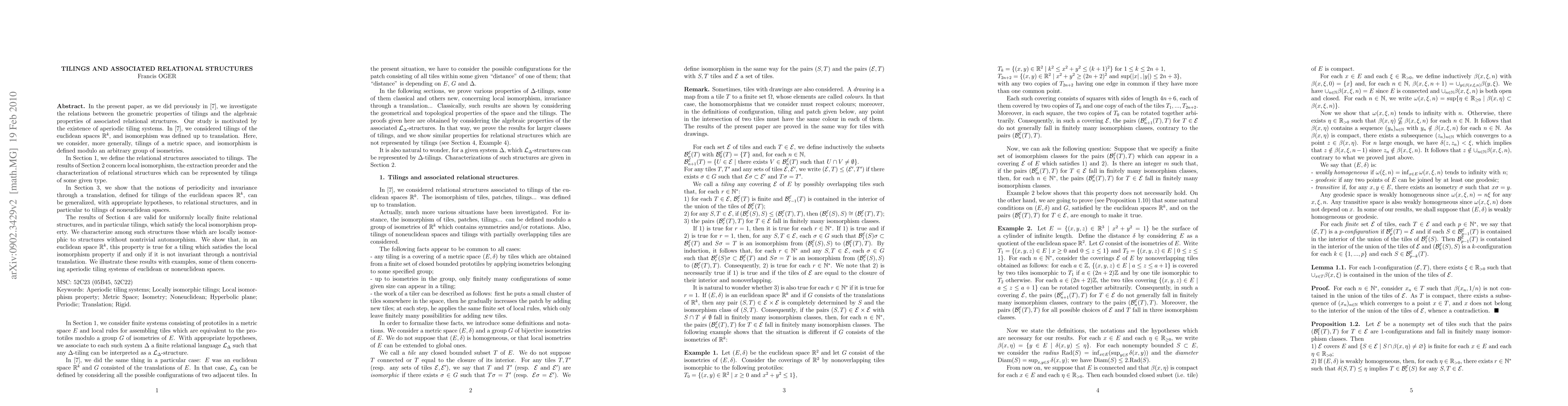 This paper explores the connections between the geometric properties of tilings and the algebraic properties of their associated relational structures, extending previous work to more general metric spaces. It characterizes local isomorphism, periodicity, and invariance in these structures, particularly focusing on aperiodic tiling systems.