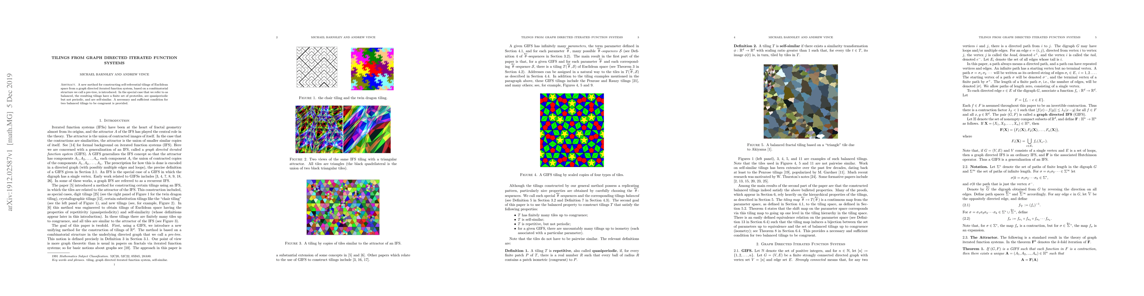 A new method for constructing self-referential tilings of Euclidean space from a graph directed iterated function system, based on a combinatorial structure we call a pre-tree, is introduced. In the special case that we refer to as balanced, the resulting tilings have a finite set of prototiles, are quasiperiodic but not periodic, and are self-similar. A necessary and sufficient condition for two balanced tilings to be congruent is provided.