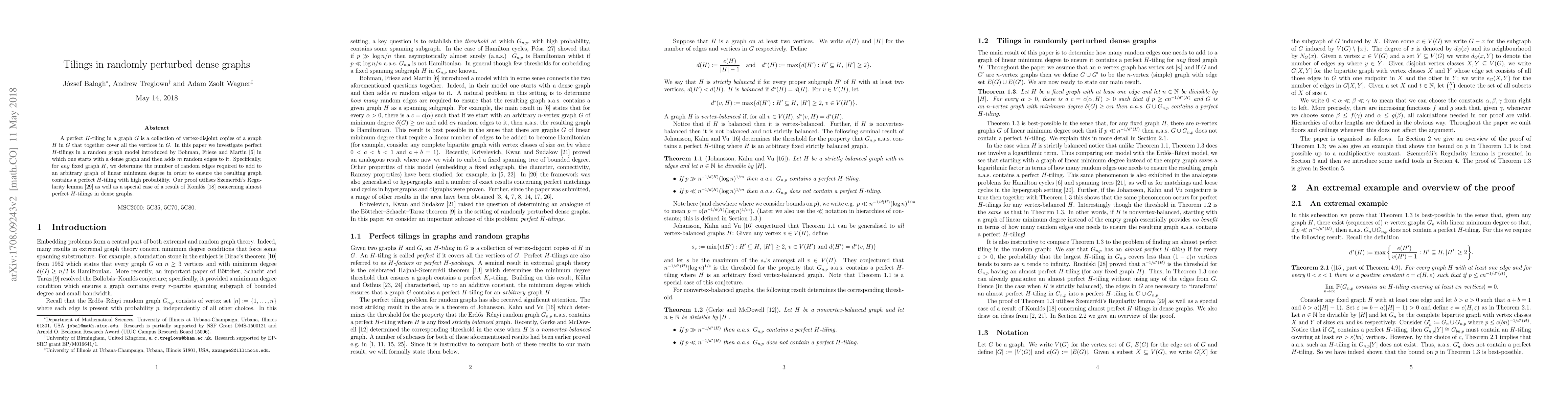 This paper studies perfect $H$-tilings in randomly perturbed dense graphs, determining the number of random edges needed to ensure a perfect $H$-tiling with high probability. The proof leverages Szemerédi's Regularity Lemma and a result by Komlós on almost perfect $H$-tilings.