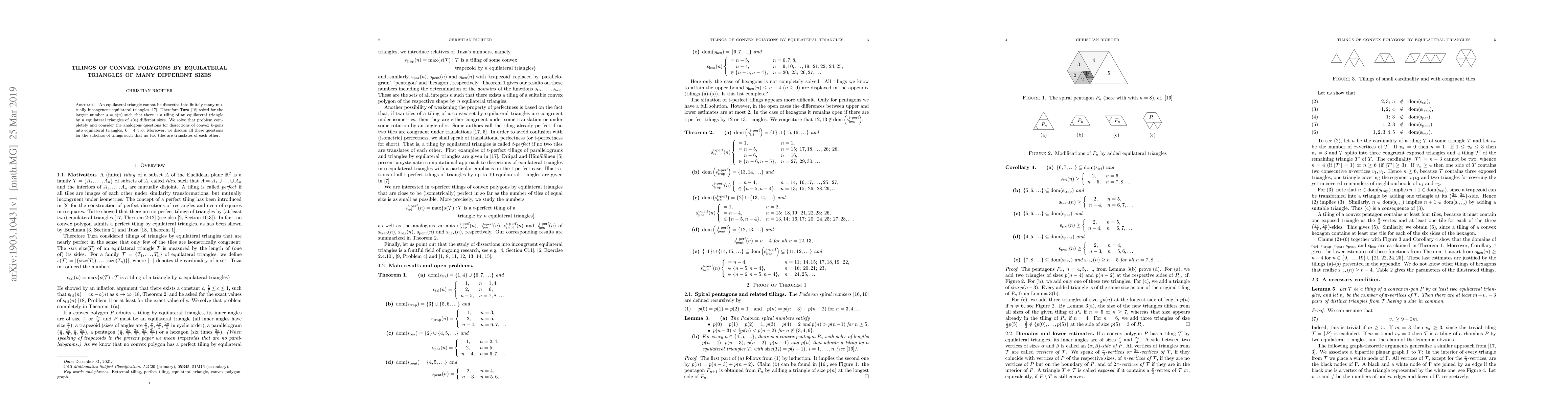 An equilateral triangle cannot be dissected into finitely many mutually incongruent equilateral triangles [Tutte 1948]. Therefore Tuza [Tuza 1991] asked for the largest number $s=s(n)$ such that there is a tiling of an equilateral triangle by $n$ equilateral triangles of $s(n)$ different sizes. We solve that problem completely and consider the analogous questions for dissections of convex $k$-gons into equilateral triangles, $k=4,5,6$. Moreover, we discuss all these questions for the subclass of tilings such that no two tiles are translates of each other.