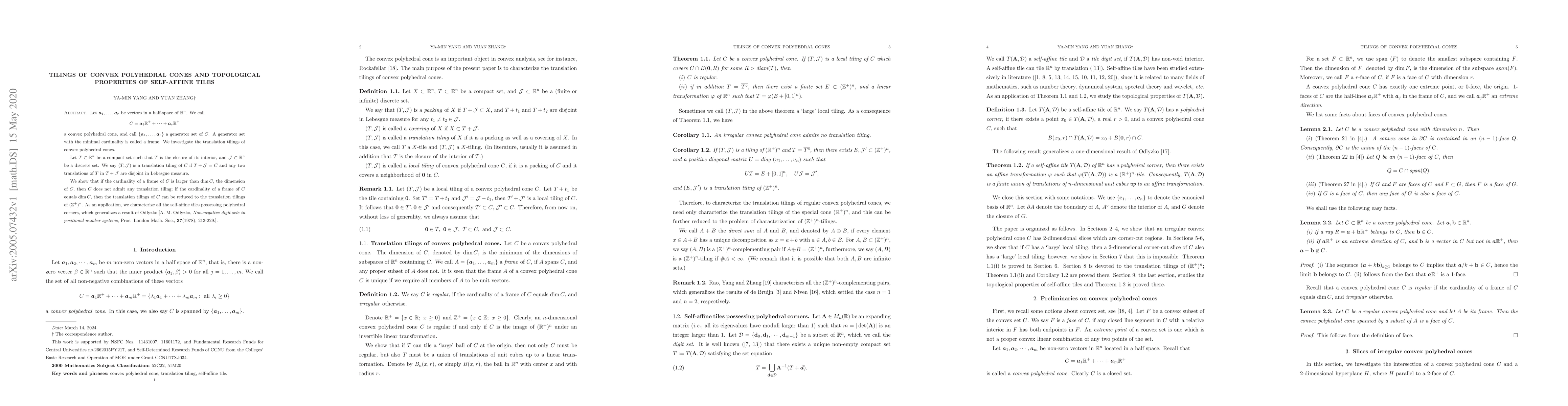The research paper investigates translation tilings of convex polyhedral cones, finding that cones with a frame size larger than their dimension cannot be tiled, while those with frame size equal to the dimension can be reduced to tiling smaller sets.