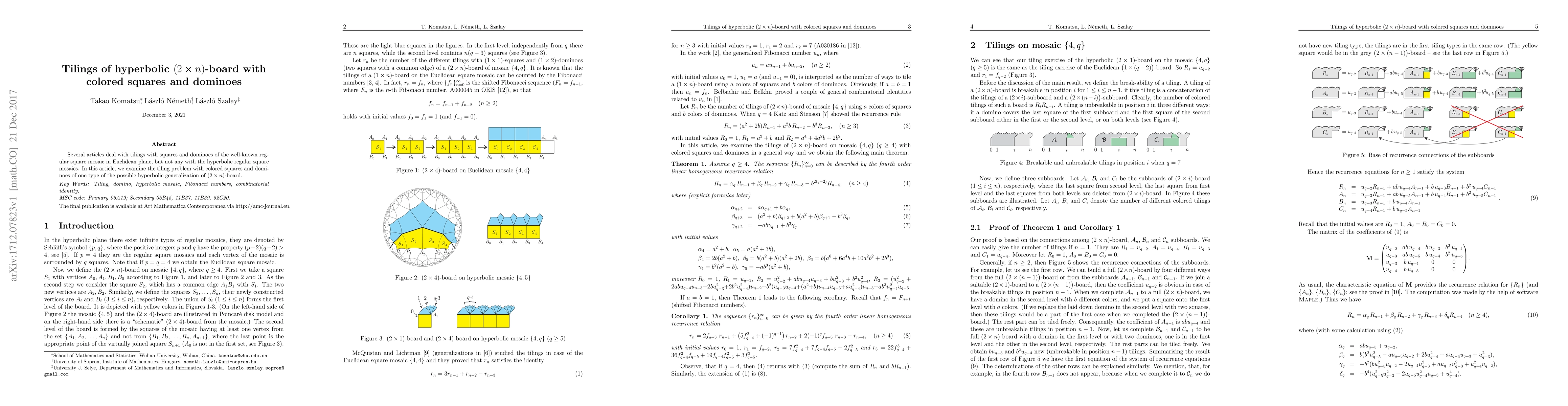 This paper investigates the tiling problem of a hyperbolic $(2\times n)$-board using colored squares and dominoes, extending the classical Euclidean tiling problem to a hyperbolic setting. The study aims to explore the combinatorial properties and patterns in this novel hyperbolic context.