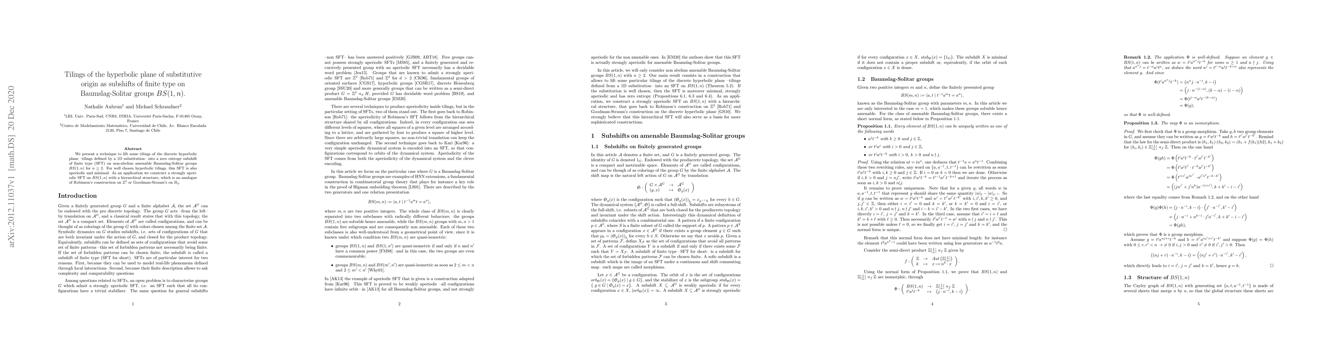 Researchers develop a method to convert tilings of the hyperbolic plane into subshifts on non-abelian amenable Baumslag-Solitar groups, resulting in strongly aperiodic SFTs with hierarchical structures.