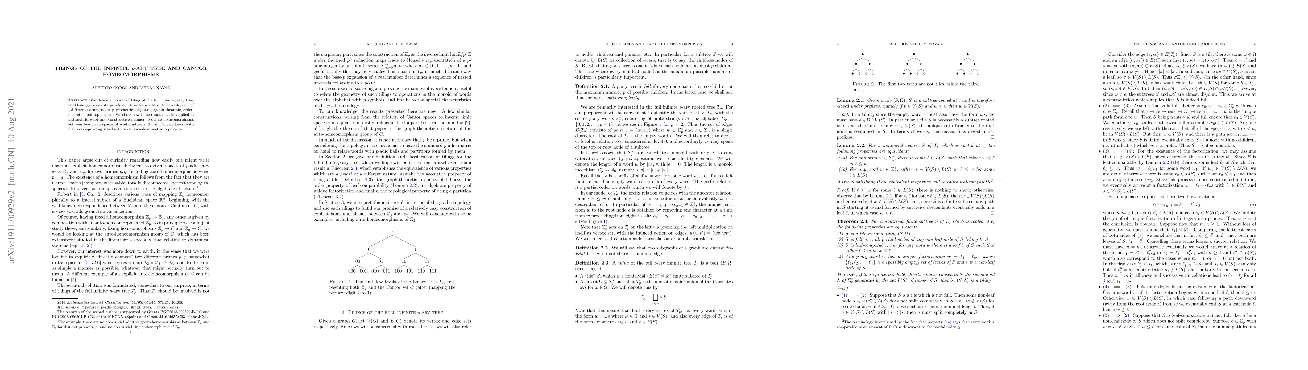 We define a notion of tiling of the full infinite $p$-ary tree, establishing a series of equivalent criteria for a subtree to be a tile, each of a different nature; namely, geometric, algebraic, graph-theoretic, order-theoretic, and topological. We show how these results can be applied in a straightforward and constructive manner to define homeomorphisms between two given spaces of $p$-adic integers, $\mathbb{Z}_{p}$ and $\mathbb{Z}_{q}$, endowed with their corresponding standard non-archimedean metric topologies.