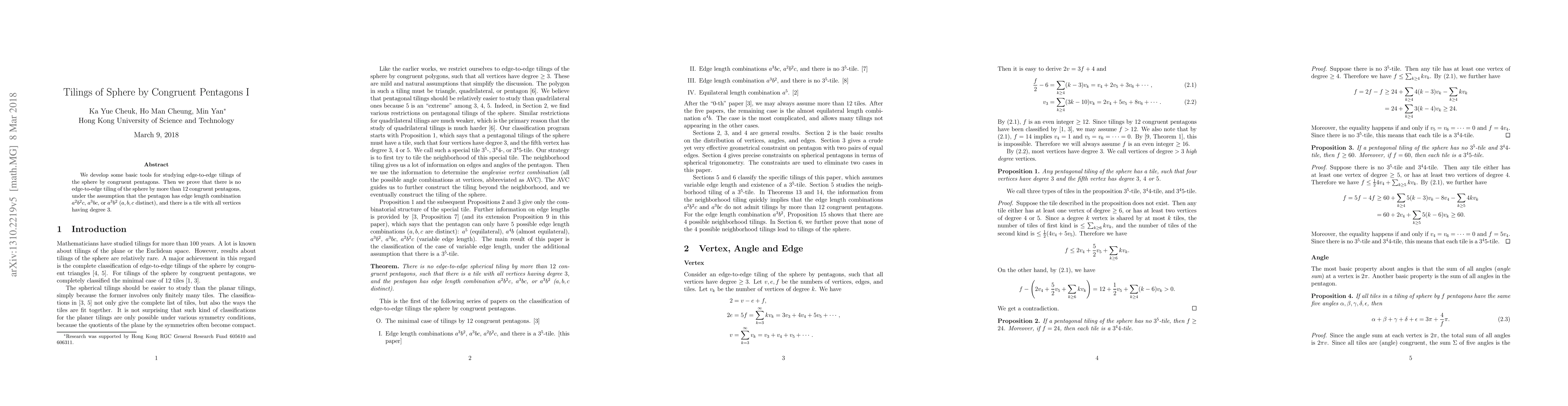 Summary: The study concludes that no edge-to-edge tilings of the sphere by congruent pentagons exist beyond the dodecahedron's tiling, specifically when considering tiles with all vertices of degree 3 and three out of five possible edge length combinations.