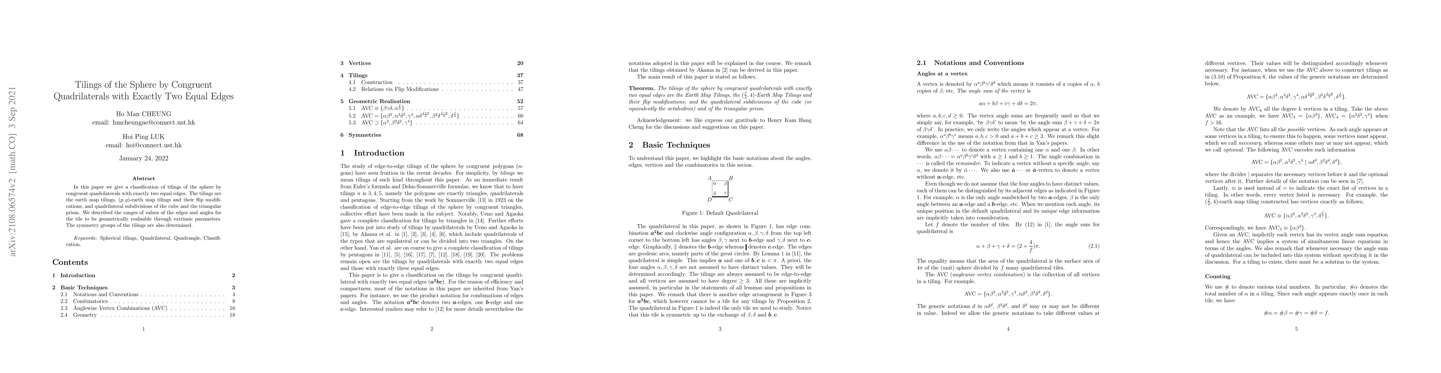 This paper classifies tilings of the sphere using congruent quadrilaterals with exactly two equal edges, identifying earth map tilings, $(p,q)$-earth map tilings, and their flip modifications, alongside subdivisions of the cube and triangular prism. It also determines the geometric realizability ranges for edges and angles and analyzes the symmetry groups of these tilings.