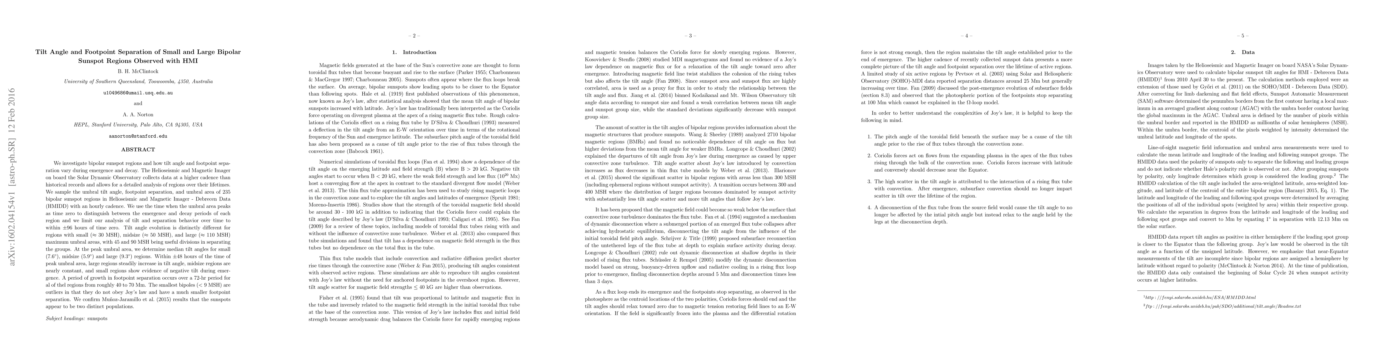 This study analyzes the tilt angle and footpoint separation of 235 bipolar sunspot regions using data from the HMI on the Solar Dynamics Observatory. The research reveals distinct tilt angle evolution patterns for small, midsize, and large sunspot regions, with significant differences in their behavior during emergence and decay phases.