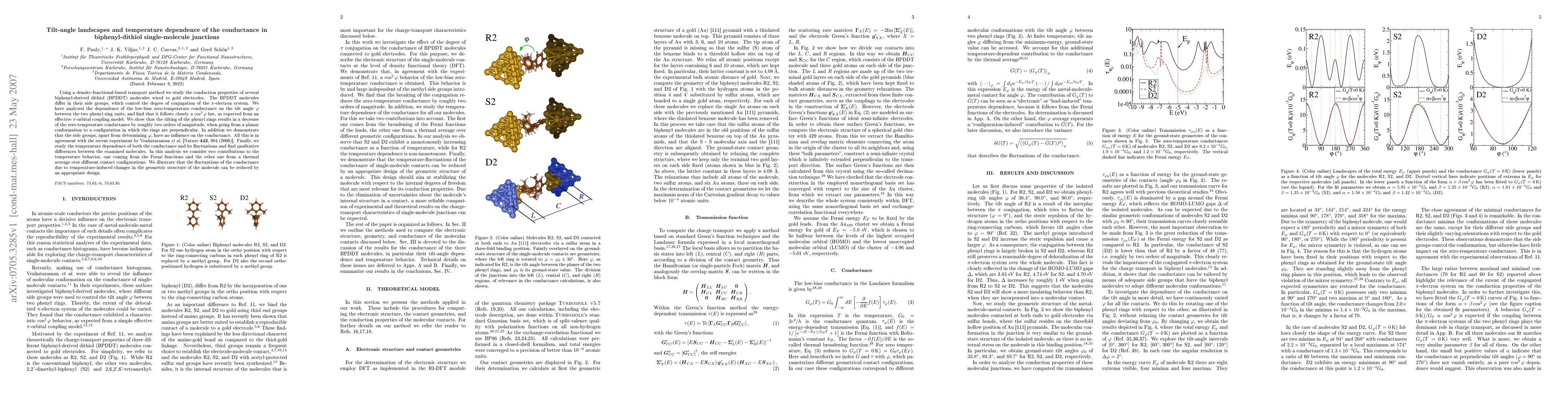 The research uses density-functional-based transport method to analyze biphenyl-dithiol molecules' conductance on gold electrodes, showing a cos^2(phi) tilt angle dependence. It also explores temperature effects on conductance, revealing differences between molecules and potential for structure design to minimize thermal fluctuations.