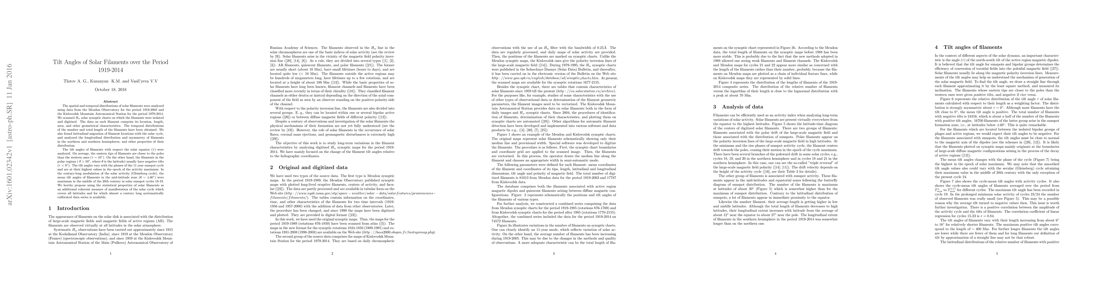 This study analyzes solar filament tilt angles over 1919-2014, finding that eastern tips tend to be closer to the poles than western ones, with variations that follow the 11-year sunspot cycle.