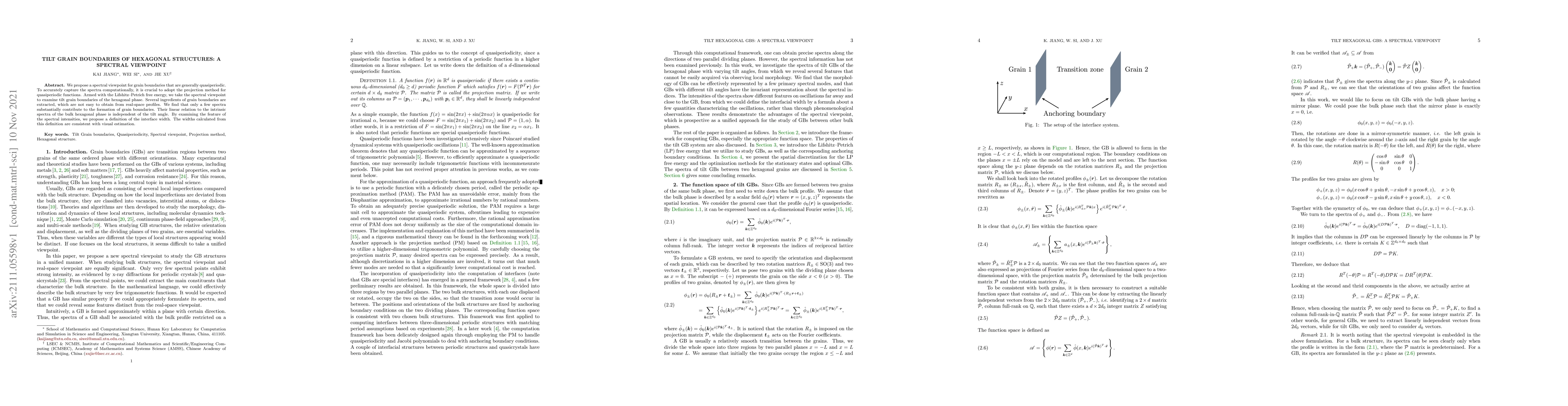 This paper introduces a spectral approach to analyze tilt grain boundaries in hexagonal structures, employing the projection method for quasiperiodic functions. It reveals that only a few spectra significantly contribute to boundary formation, maintaining a linear relation with the bulk phase's intrinsic spectra, and proposes a new definition of interface width consistent with visual estimates.