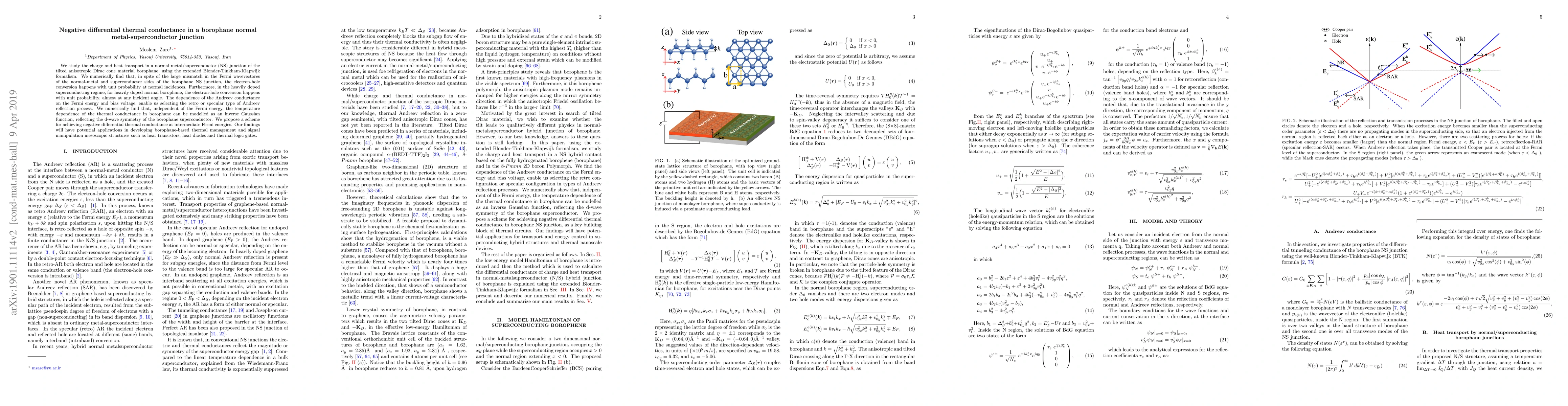 We study charge and heat transport in normal-metal/superconductor (NS) hybrid junction, based on a tilted anisotropic Dirac material. Using the extended Blonder-Tinkham-Klapwijk formalism, the conductance spectra of NS borophane, a two-dimensional Dirac semimetal with two tilted anisotropic Dirac cones in its dispersion, is investigated. Completely different from the usual normal-metal-superconductor junctions, in spite of the large mismatch in Fermi wavevectores of the normal-metal and superconductor sides of the borophane NS junction, the electron-hole conversion happens with unit probability at normal incidences. Furthermore, we demonstrate that in the heavily doped superconducting regime for heavily doped normal borophane, the electron-hole conversion happens with unit probability, approximately at any incident angle. The dependence of the Andreev with Fermi energy and bias voltage, enable us, selecting the retroconfiguration or specular configuration in types of Andreev reflection processes. We numerically establish an anomalous behavior of thermal conductance in borophane. The tilting of the Dirac cones gives rise to an anomalous behaviour in the thermal conductance of the NS hybrid junction of borophane, such that the thermal conductance decreases by increasing the temperature. Our findings will have potential applications for transport and energy control in superconducting quantum interference devices and hybridized mesoscopic systems.