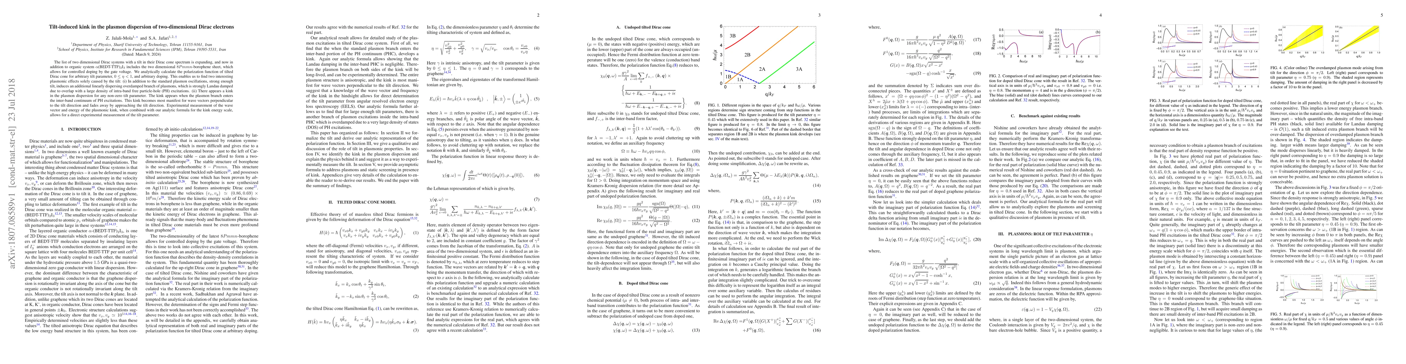 The list of two dimensional Dirac systems with a tilt in their Dirac cone spectrum is expanding, and now in addition to organic system $\alpha$(BEDT-TTF)$_2$I$_3$ includes the two dimensional $8Pmmn$-borophene sheet, which allows for controlled doping by the gate voltage. We analytically calculate the polarization function of tilted Dirac cone for arbitrary tilt parameter, $0\le \eta <1$, and arbitrary doping. This enables us to find two interesting plasmonic effects solely caused by the tilt: (i) In addition to the standard plasmon oscillations, strong enough tilt, induces an additional linearly dispersing overdamped branch of plasmons, which is strongly Landau damped due to overlap with a large density of intra-band free particle-hole (PH) excitations. (ii) There appears a kink in the plasmon dispersion for any non-zero tilt parameter. The kink appears when the plasmon branch enters the inter-band continuum of PH excitations. This kink becomes most manifest for wave vectors perpendicular to the tilt direction and fades away by approaching the tilt direction. Experimental measurement of the wave vector and energy of the plasmonic kink, when combined with our analytic formula for the kink energy scale, allows for a direct experimental measurement of the tilt parameter.