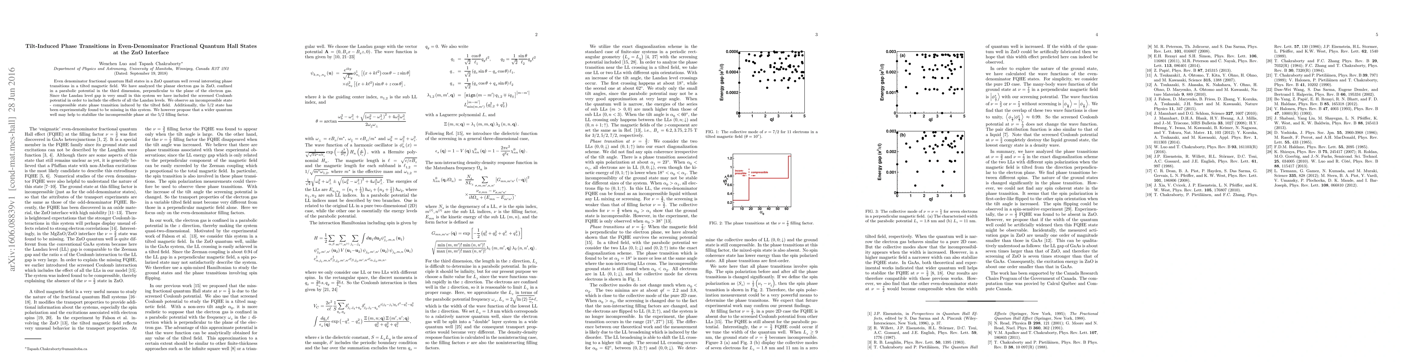 Researchers found a phase transition in even-denominator fractional quantum Hall states at the ZnO interface when the magnetic field is tilted, with an incompressible state transitioning to a compressible state. They propose that a wider quantum well could stabilize the incompressible phase at the 5/2 filling factor.