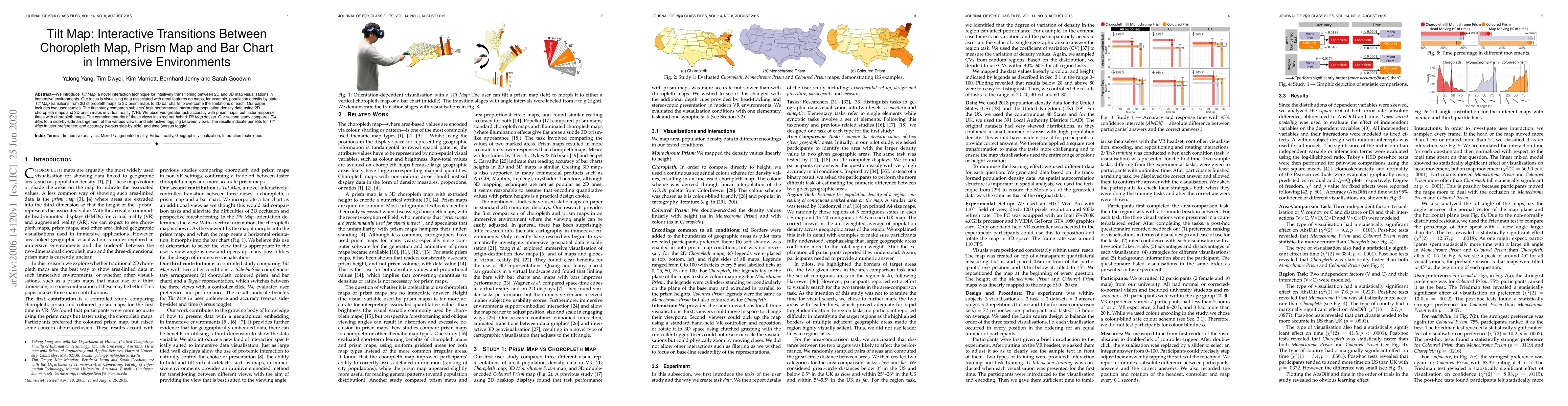 Tilt Map presents an innovative interaction technique for transitioning between 2D choropleth maps, 3D prism maps, and 2D bar charts in immersive environments, addressing the limitations of each. User studies show prism maps improve task accuracy while choropleth maps reduce response times, leading to the hybrid Tilt Map design that enhances user preference, accuracy, and efficiency.