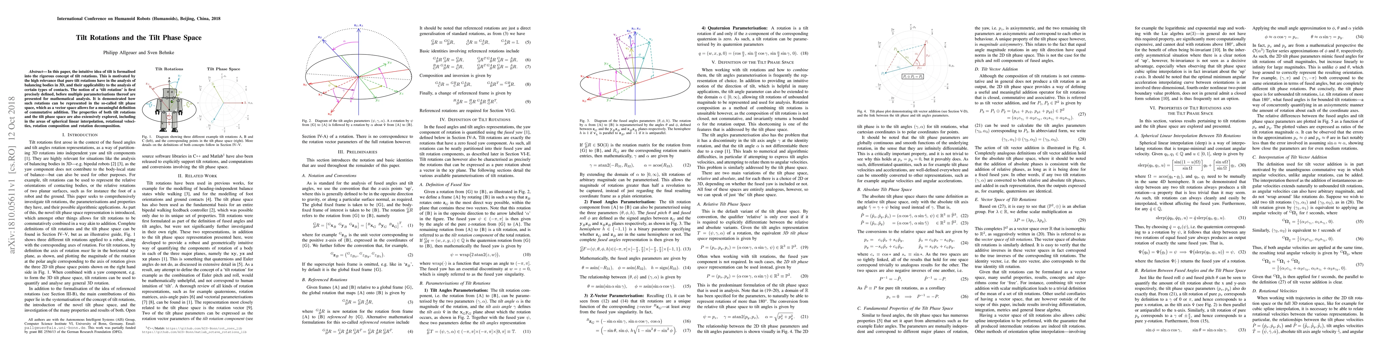 This paper formalizes the concept of tilt rotations, crucial for analyzing balancing bodies in 3D and certain types of contacts, and explores their representation in the tilt phase space. It investigates various parameterizations and properties, including commutative addition, spherical linear interpolation, and rotation composition.