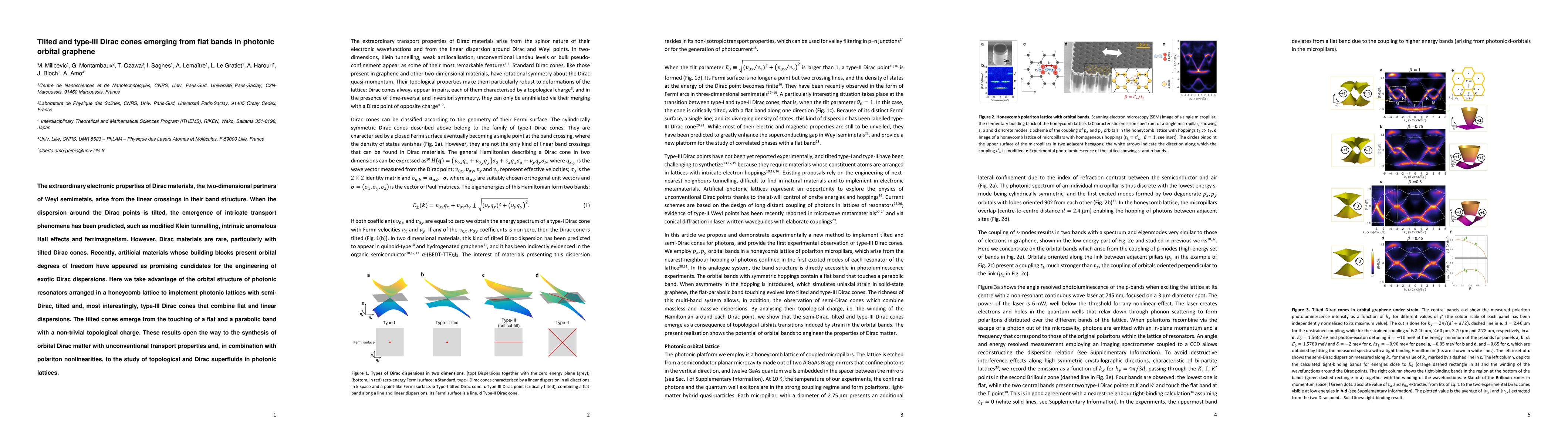 This research demonstrates the creation of photonic orbital graphene with semi-Dirac, tilted, and type-III Dirac cones from flat bands, showcasing potential for novel transport phenomena and the study of topological superfluids in photonic lattices.