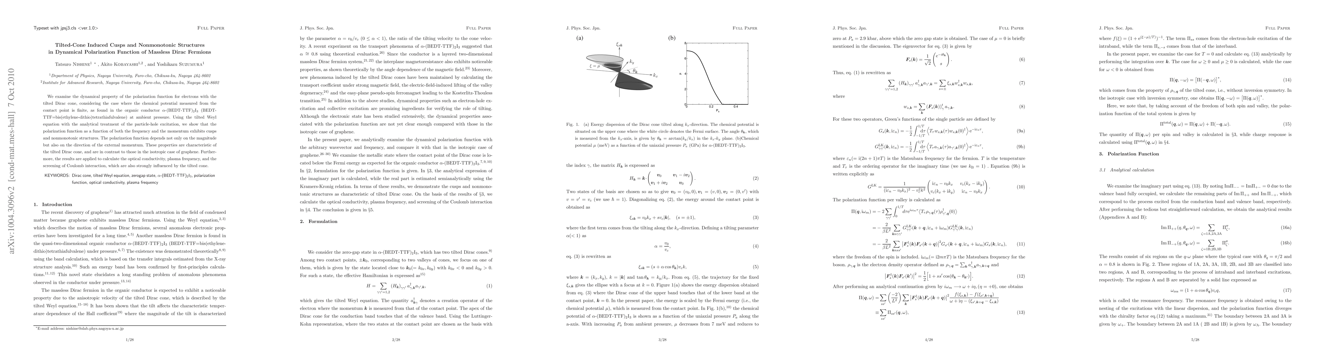 This study investigates the dynamical polarization function of massless Dirac fermions in organic conductors, revealing cusps and nonmonotonic structures due to tilted-cone geometry. The polarization function is shown to be sensitive to both frequency and the direction of external momentum, contrasting with the isotropic case of graphene. The findings also inform optical conductivity, plasma frequency, and Coulomb interaction screening.