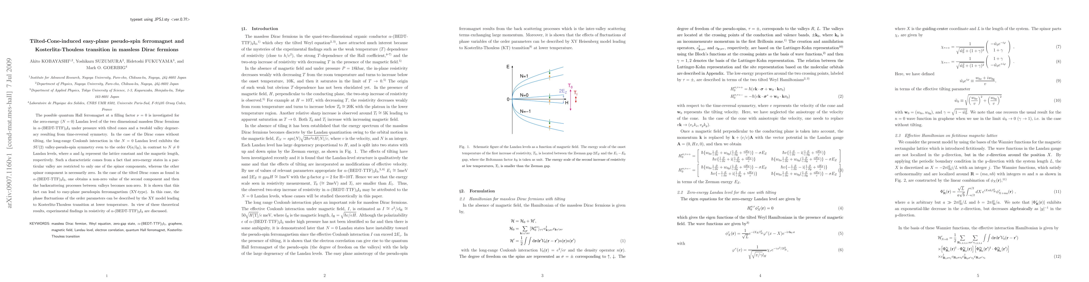 This paper investigates the quantum Hall ferromagnet at a filling factor $\nu =0$ in massless Dirac fermions, focusing on tilted-cone effects and their role in inducing easy-plane pseudospin ferromagnetism in $\alpha$-(BEDT-TTF)$_2$I$_3$. It finds that tilted Dirac cones lead to Kosterlitz-Thouless transition due to nonzero scattering processes between valleys.