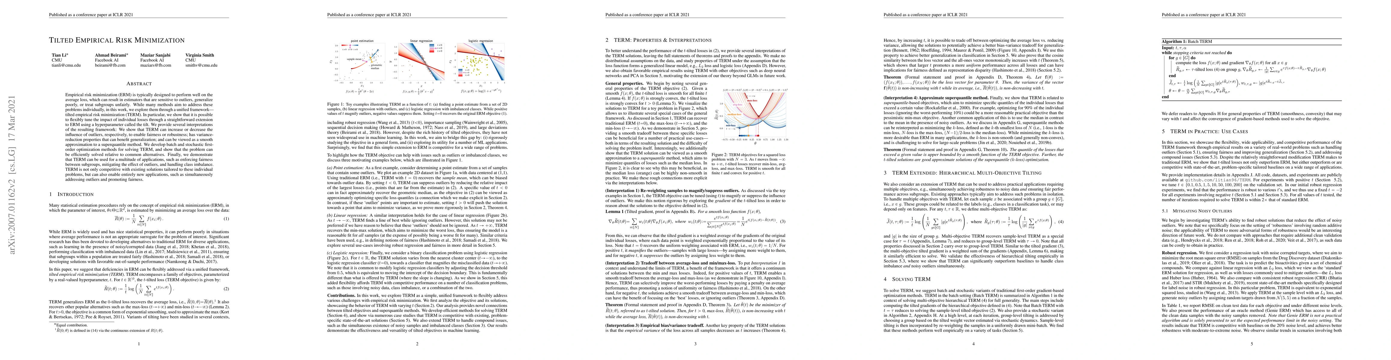 Tilted Empirical Risk Minimization (TERM) extends traditional empirical risk minimization (ERM) to flexibly adjust the influence of individual losses via a tunable hyperparameter. This approach enhances robustness, generalization, and fairness by increasing or decreasing the impact of outliers, thus addressing various issues in a unified framework.