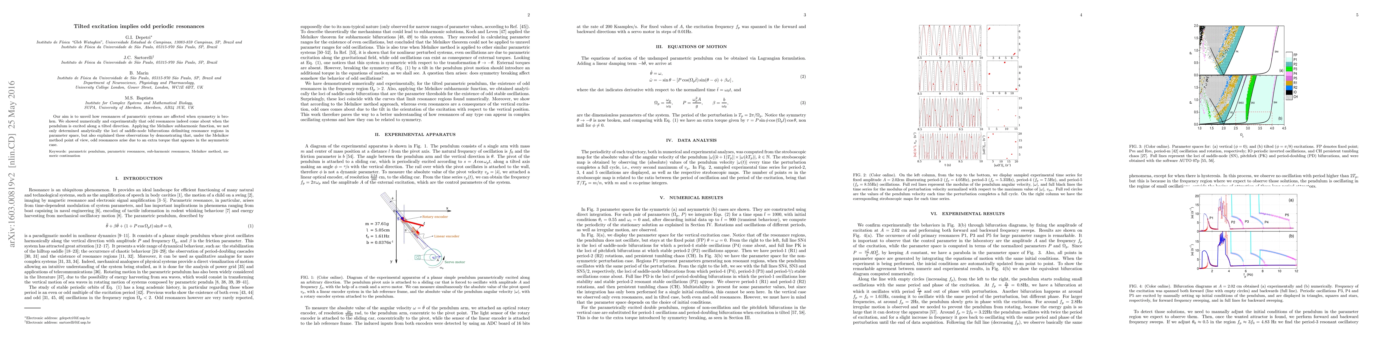 Our aim is to unveil how resonances of parametric systems are affected when symmetry is broken. We showed numerically and experimentally that odd resonances indeed come about when the pendulum is excited along a tilted direction. Applying the Melnikov subharmonic function, we not only determined analytically the loci of saddle-node bifurcations delimiting resonance regions in parameter space, but also explained these observations by demonstrating that, under the Melnikov method point of view, odd resonances arise due to an extra torque that appears in the asymmetric case.