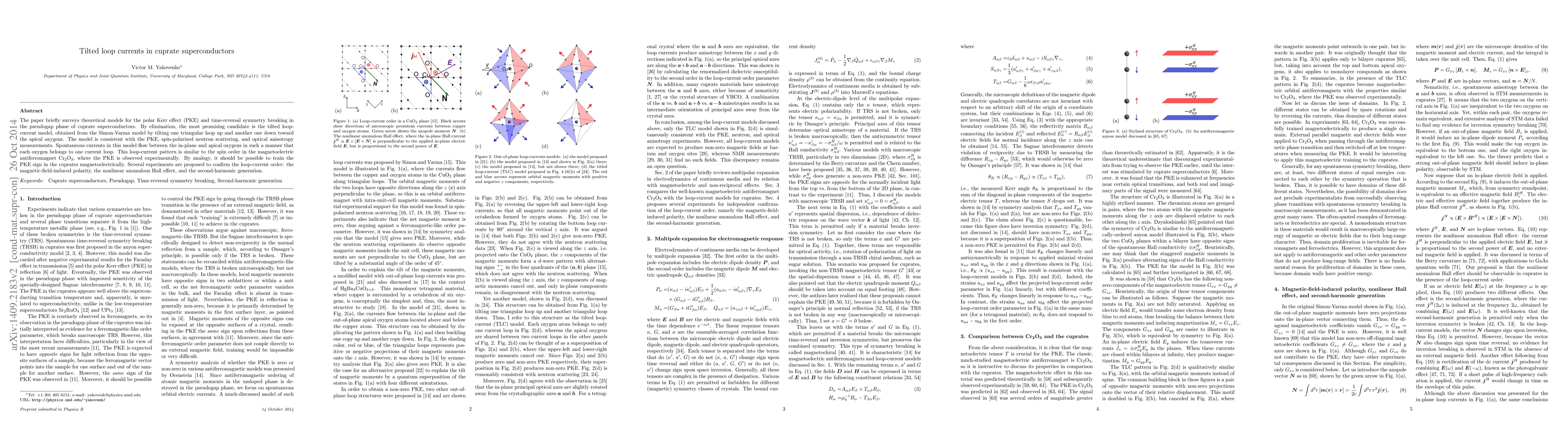 The paper proposes the tilted loop-current model as the most promising explanation for the polar Kerr effect and time-reversal symmetry breaking in cuprate superconductors, supported by various experimental observations. Proposed experiments include magnetic-field-induced polarity, nonlinear anomalous Hall effect, and second-harmonic generation to confirm this model.