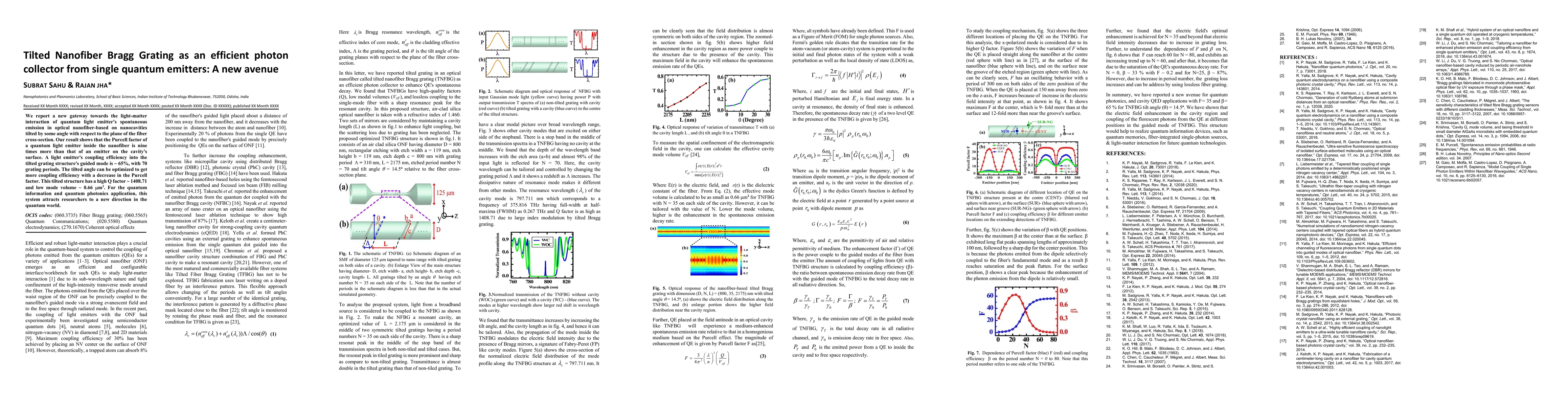 This paper introduces a tilted nanofiber Bragg grating (TNFBG) to significantly boost the spontaneous emission rate of single quantum emitters, achieving a 65% coupling efficiency and a high Q factor of ~1408.71. The optimized structure enhances the Purcell factor by a factor of nine compared to traditional emitters, promising advancements in quantum information and metrology.