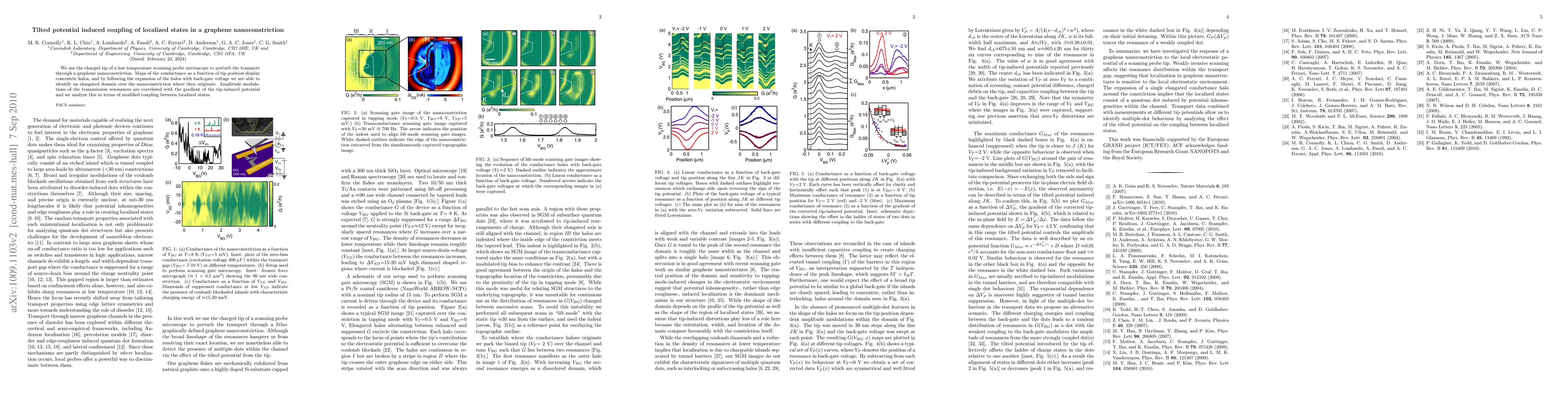 This study investigates the transport behavior in a graphene nanoconstriction using a charged scanning probe microscope tip, revealing concentric halos in conductance maps. The research identifies an elongated domain where these halos originate, correlating amplitude modulations of transmission resonances with the gradient of the induced potential, suggesting altered coupling between localized states.