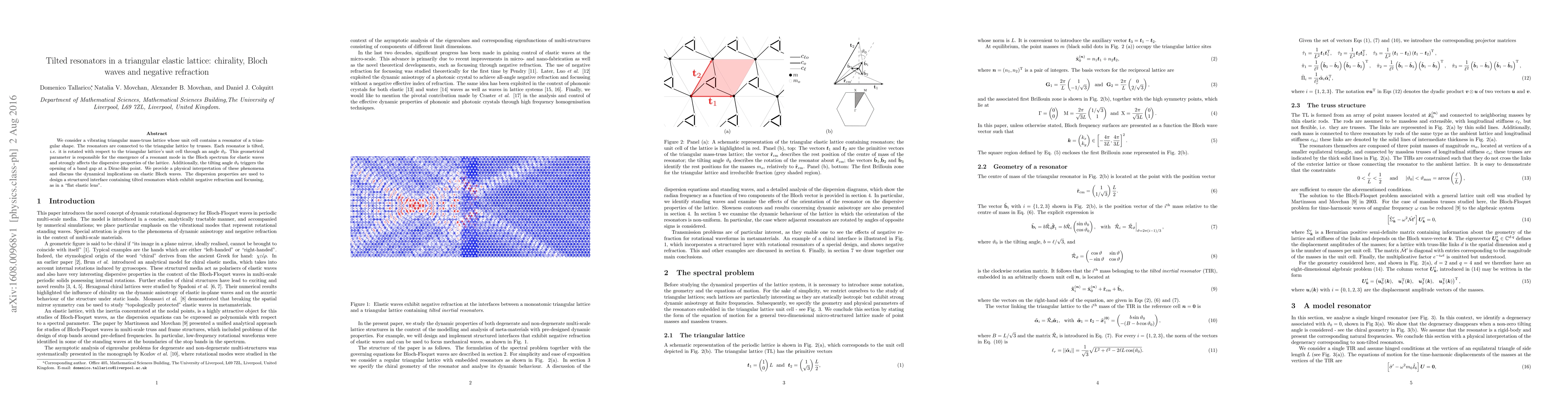 This paper investigates a triangular elastic lattice with tilted triangular resonators, revealing chirality, Bloch waves, and negative refraction. The tilting angle induces a resonant mode and a band gap opening, enabling the design of a "flat elastic lens" with negative refraction and focusing capabilities.