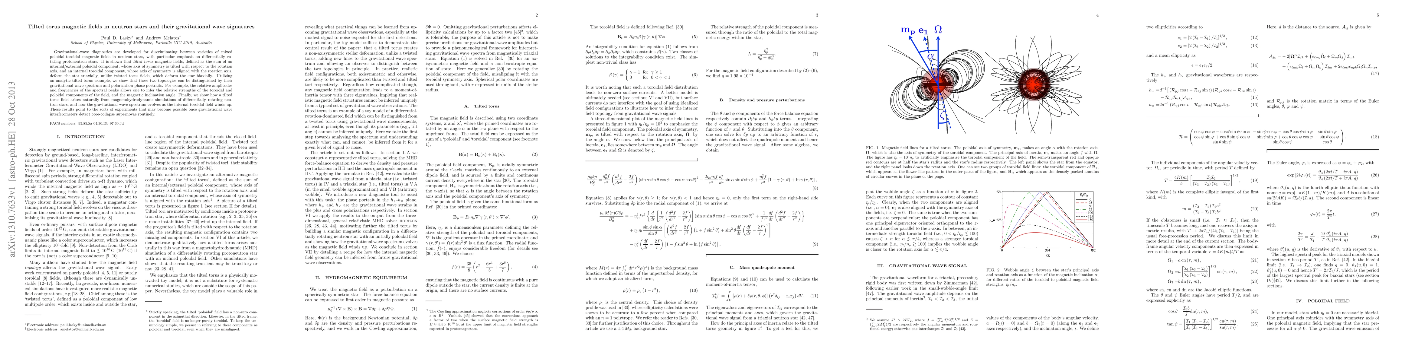 Gravitational-wave diagnostics are developed for discriminating between varieties of mixed poloidal-toroidal magnetic fields in neutron stars, with particular emphasis on differentially rotating protoneutron stars. It is shown that tilted torus magnetic fields, defined as the sum of an internal/external poloidal component, whose axis of symmetry is tilted with respect to the rotation axis, and an internal toroidal component, whose axis of symmetry is aligned with the rotation axis, deform the star triaxially, unlike twisted torus fields, which deform the star biaxially. Utilizing an analytic tilted torus example, we show that these two topologies can be distinguished by their gravitational wave spectrum and polarization phase portraits. For example, the relative amplitudes and frequencies of the spectral peaks allows one to infer the relative strengths of the toroidal and poloidal components of the field, and the magnetic inclination angle. Finally, we show how a tilted torus field arises naturally from magnetohydrodynamic simulations of differentially rotating neutron stars, and how the gravitational wave spectrum evolves as the internal toroidal field winds up. These results point to the sorts of experiments that may become possible once gravitational wave interferometers detect core-collapse supernovae routinely.