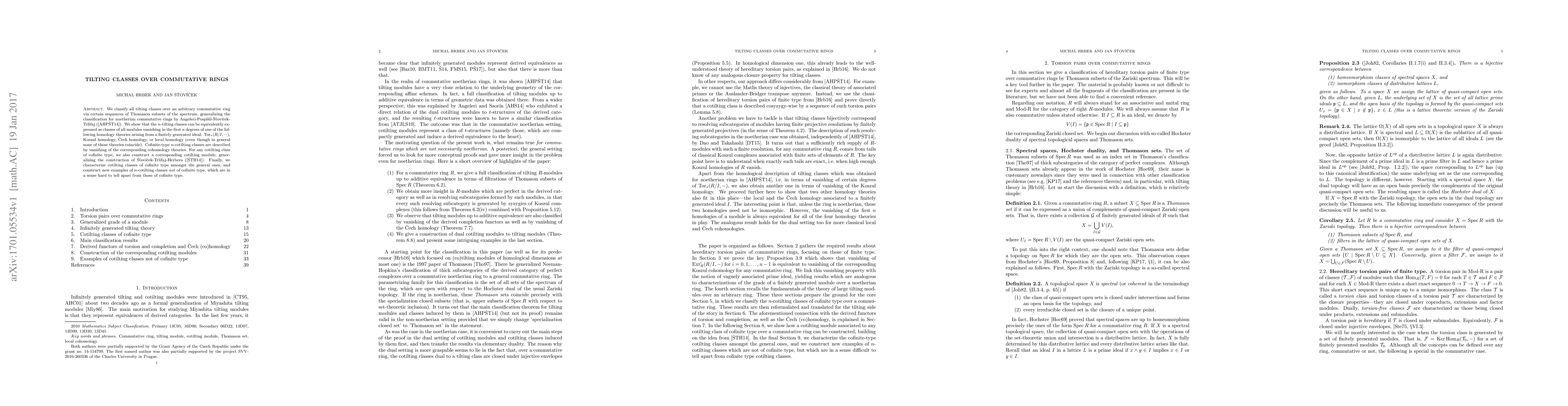 We classify all tilting classes over an arbitrary commutative ring via certain sequences of Thomason subsets of the spectrum, generalizing the classification for noetherian commutative rings by Angeleri-Posp\'i\v{s}il-\v{S}\v{t}ov\'i\v{c}ek-Trlifaj. We show that the n-tilting classes can be equivalently expressed as classes of all modules vanishing in the first n degrees of one of the following homology theories arising from a finitely generated ideal: Tor_*(R/I,-), Koszul homology, \v{C}ech homology, or local homology (even though in general none of those theories coincide). Cofinite-type n-cotilting classes are described by vanishing of the corresponding cohomology theories. For any cotilting class of cofinite type, we also construct a corresponding cotilting module, generalizing the construction of \v{S}\v{t}ov\'i\v{c}ek-Trlifaj-Herbera. Finally, we characterize cotilting classes of cofinite type amongst the general ones, and construct new examples of n-cotilting classes not of cofinite type, which are in a sense hard to tell apart from those of cofinite type.